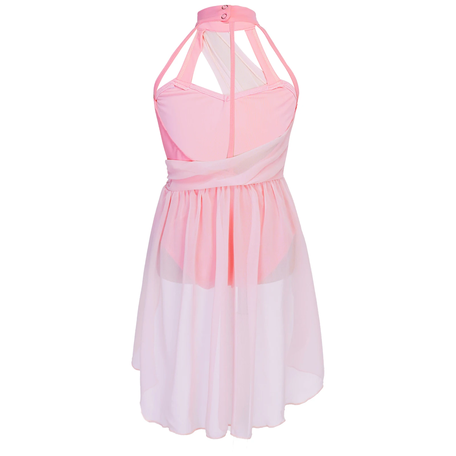 Kids Girls Sleeveless Ruched Bodice Caged Back Chiffon Lyrical Dance Dress Child Ballet Dance Leotard Dress Modern Dance Costume