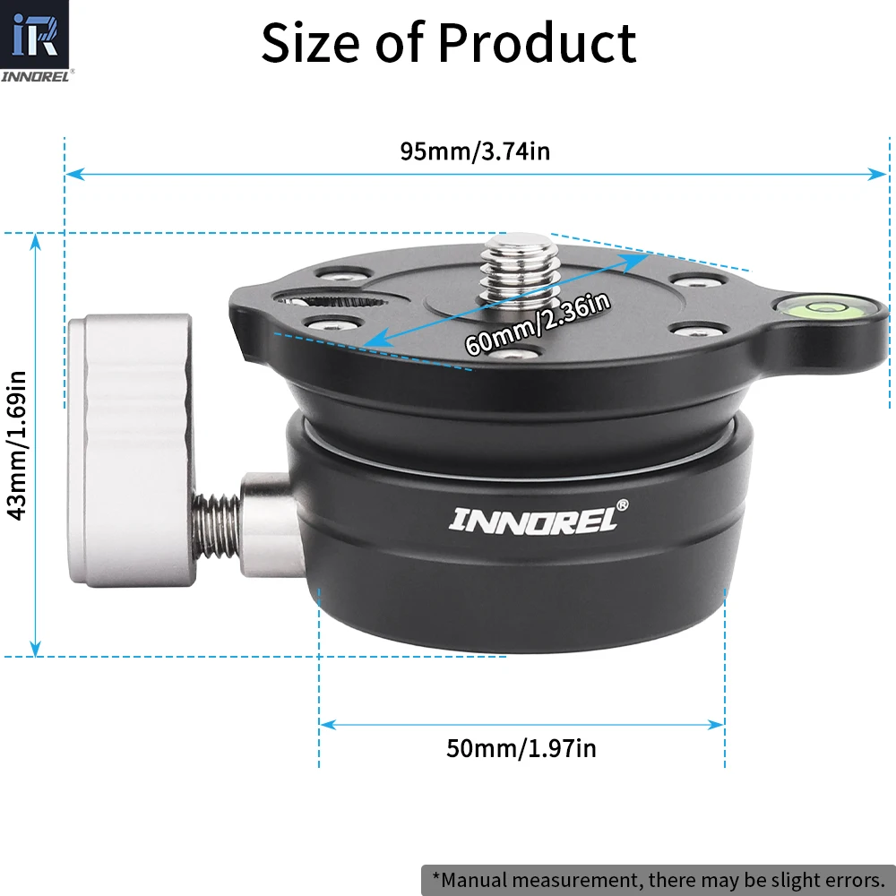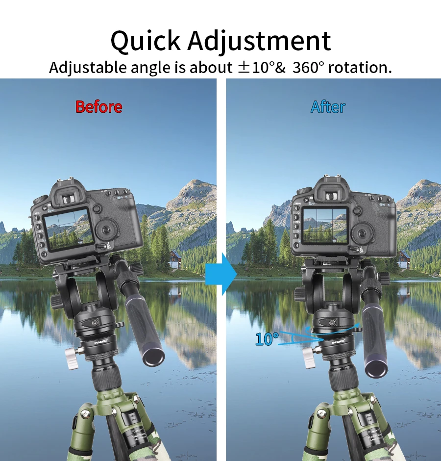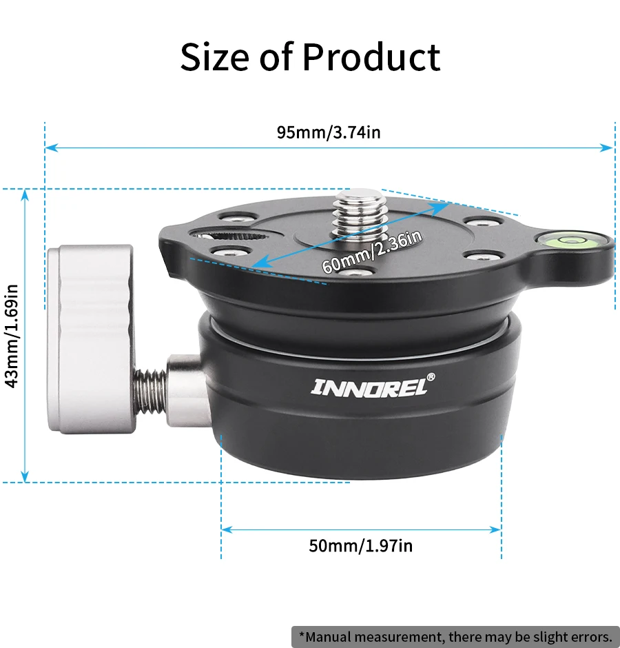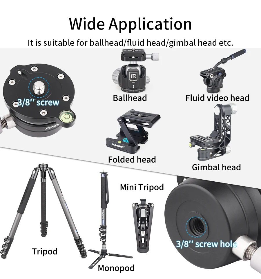 【Широкое применение 】 верхний винт 3/8 "может быть установлен с шариковыми головками, жидкой головкой, z гибкими головками и карданными головками. Нижний диаметр составляет 50 мм, а резьбовое отверстие 3/8 дюйма подходит для большинства штативов и моноподов.