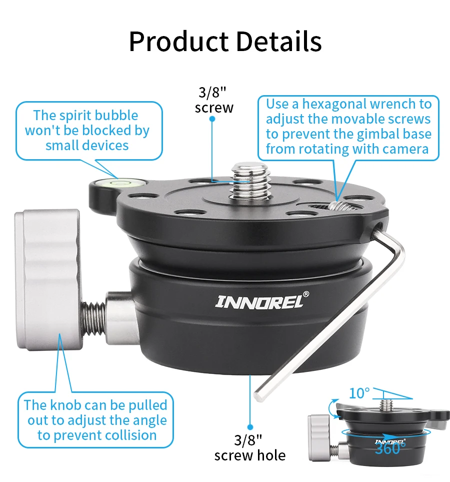 [Простая, но долговечная] Максимальная нагрузка составляет до 10 кг, а вес нетто составляет около 0,2 кг. Используйте шестигранный ключ, чтобы отрегулировать подвижный винт, чтобы предотвратить вращение основания Кардана вместе с камерой.