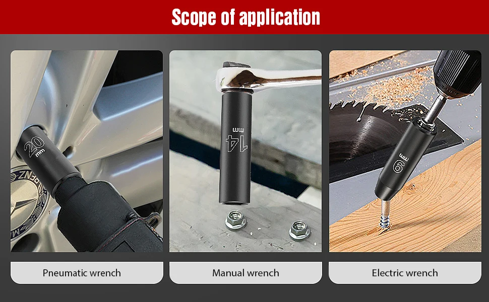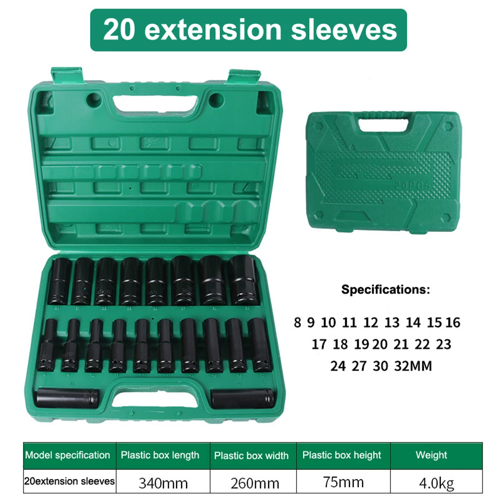 ★【Полный комплект из 20 деталей kit】включает 9-24 мм розетки для удовлетворения потребностей ежедневного технического обслуживания. Оснащен 3 '', 5'', 10 ''удлинительными прутьями для доступа к глубоким выемкам отверстий. Адаптер позволяет использовать рукав с электрическим гаечным ключом 3/8