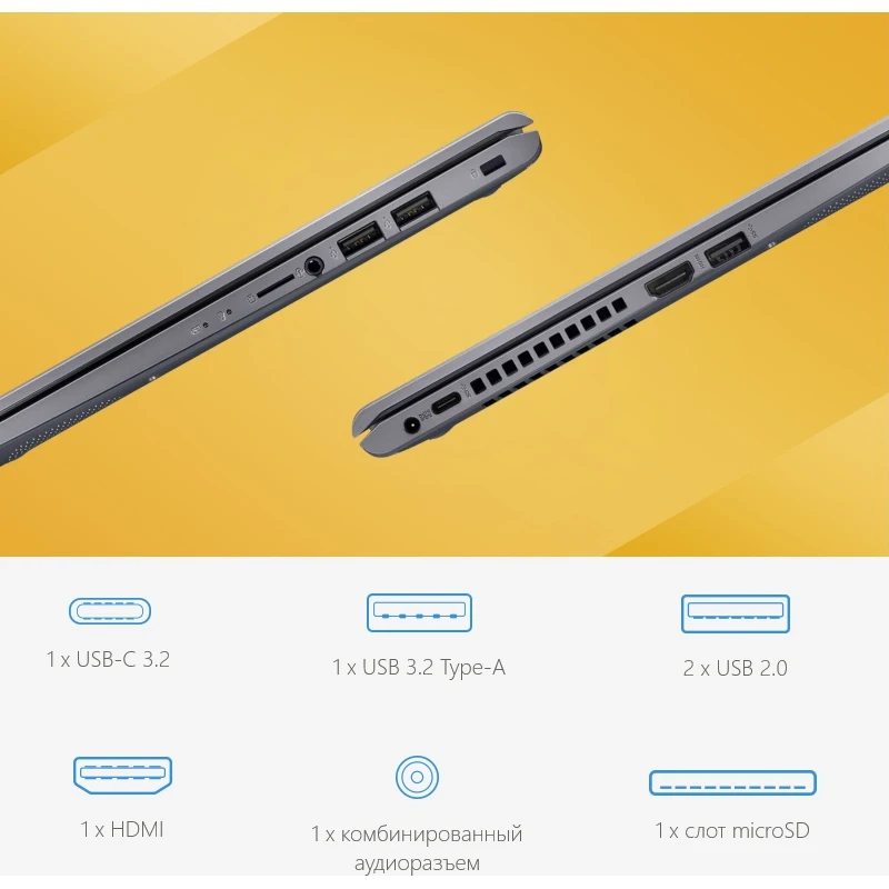 Разъемы: 1x USB 3.2 Gen 1 Type-A, 1x USB 3.2 Gen 1 Type-C, 2x USB 2.0 Type-A, 1x HDMI 1.4, 1x 3,5 мм комбинированный аудиоразъем, 1x вход DC-in