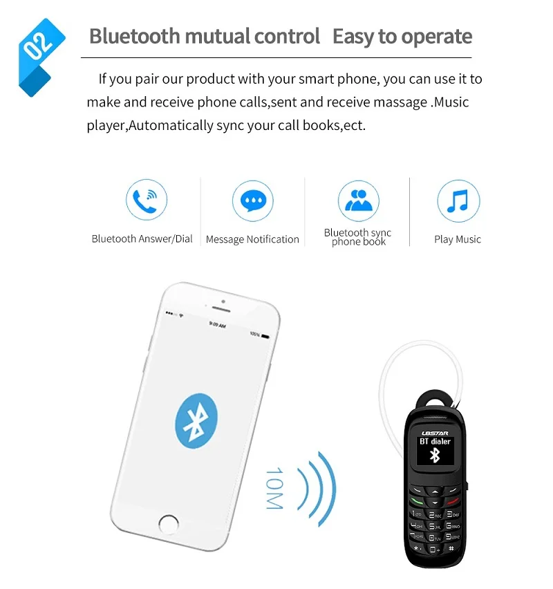 Материал: пластик Мини-размер: 61,8*23,6*11,6 мм Цвет: черный и белый 2G: GSM850/900/1800/1900 МГц Sim-карта: одна sim-карта в режиме ожидания Экран: 0,66 дюймовый oled-дисплей Bluetooth:BT2.0 Процессор: MTK6261D Тип рингтонов: Полифонический/MP3 Сообщение: SMS Вход: клавиатура Usb-порт: Micro 5 pin Динамик: 1609 динамик Камера: N/A Fm-радио: N/A Формат аудио файла: N/A Bluetooth: Да, V2.0 Слот для tf-карты: N/A Другие функции: Синхронизация звонков/ответов, воспроизведение музыки, телефонная книга с вашим умным устройством Время работы в режиме ожидания: до 120 часов Языки: английский, французский, арабский, русский, немецкий, испанский, голландский, вьетнамский. Аксессуары 1 х батарея 300 мАч 1 х USB кабель Надевается, используется как гарнитура blutooth Вставьте sim-карту, которая используется как мобильный телефон Работать вместе с различными мобильными телефонами, которые со встроенной функцией bluetooth Мини-размер, легко носить с собой и работать