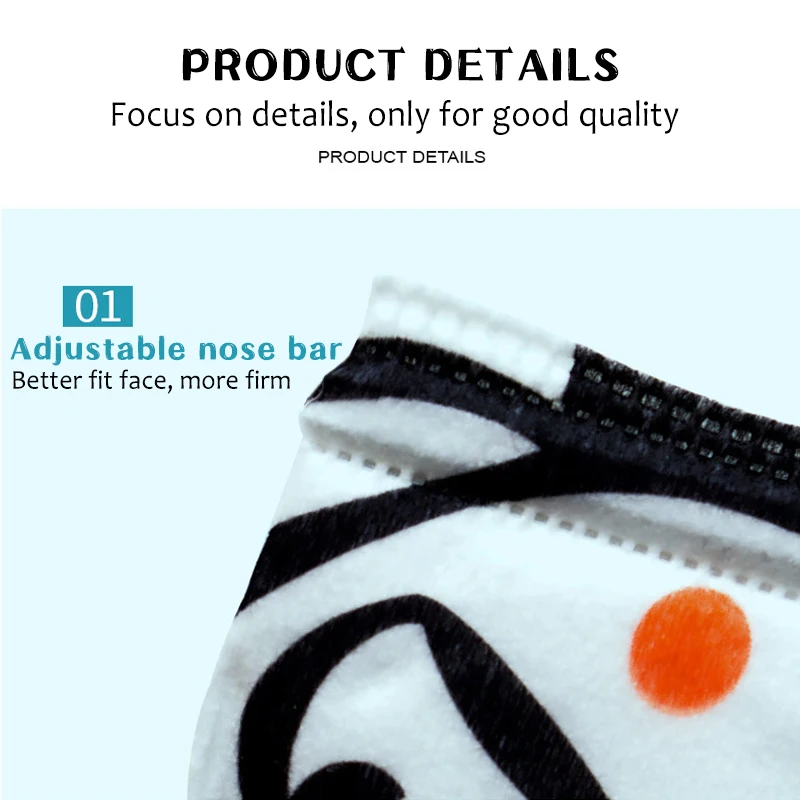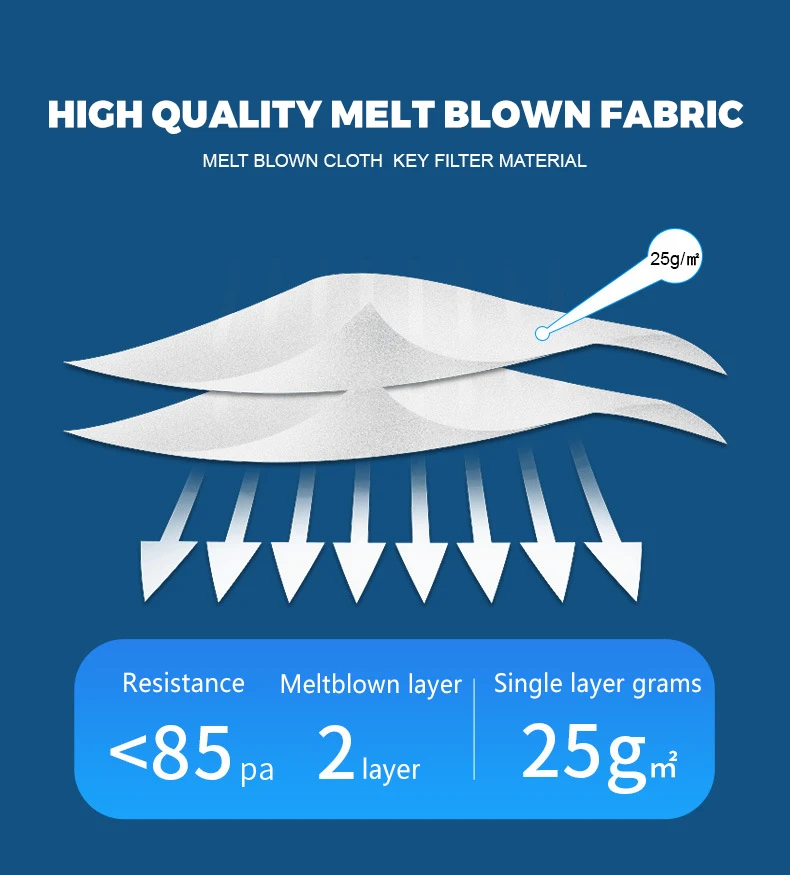 Структура продукта:Состоит из корпуса маски (включая нетканую ткань, выдувная ткань из расплава, фильтр-хлопок), ушной повязки и носоупоров