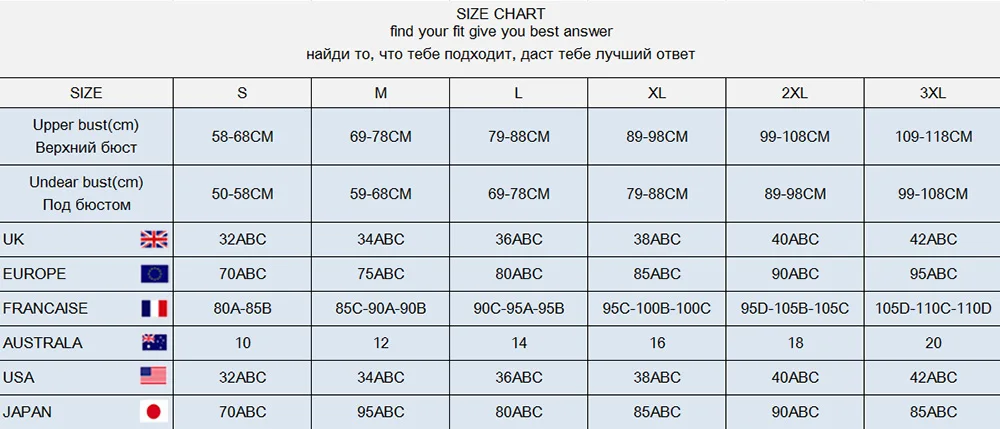 S: обхват груди: 58-68 см, обхват груди (см): 50-58 см, подходит для 30C / 32AB =(65C / 70AB) M: обхват груди: 69-78 см, обхват груди (см): 59-68 см, подходит для 32C / 34ABC =(70C / 75ABC) L: обхват груди: 79-88 см, обхват груди (см): 69-78 см, подходит для 36ABC =(80ABC) XL: обхват груди: 89-98 см, обхват груди (см): 79-88 см, подходит для 36C / 38AB =(80C / 85AB) XXL: обхват груди: 99-108 см, обхват груди (см): 89-98 см, подходит для 38C / 40ABC =(85C / 90ABC) XXXL: обхват груди: 109-118 см, обхват груди (см): 99-108 см, подходит для 40C / 42AB =(90C / 95AB) Информация о размере: