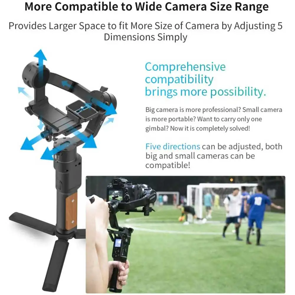 ▪Совместимость стабилизатора Gimbal здесь имеет 2 чувства: Основное/Оригинальное значение-камера может быть хорошо сбалансирована в стабилизаторе gimbal, чтобы предотвратить нежелательные движения, такие как камера shaky. В этом измерении убедитесь, что камера с размером и весом объектива соответствует стандарту gimbal blance; Передовым значением является управляющая камера от стабилизатора gimbal, например, снимок, запись видео, зум, следуйте параметрам фокуса и камеры через кабель/Wi-Fi. Но разные камеры имеют разные стандарты управления. Мы усердно работаем, чтобы сделать его более применимым;