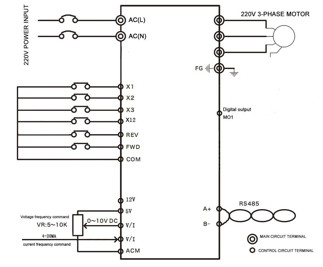 3. Он может реализовывать 0-5 В, 4-20мА аналоговый вход, и может быть подключен к внешнему потенциометру для контроля скорости.