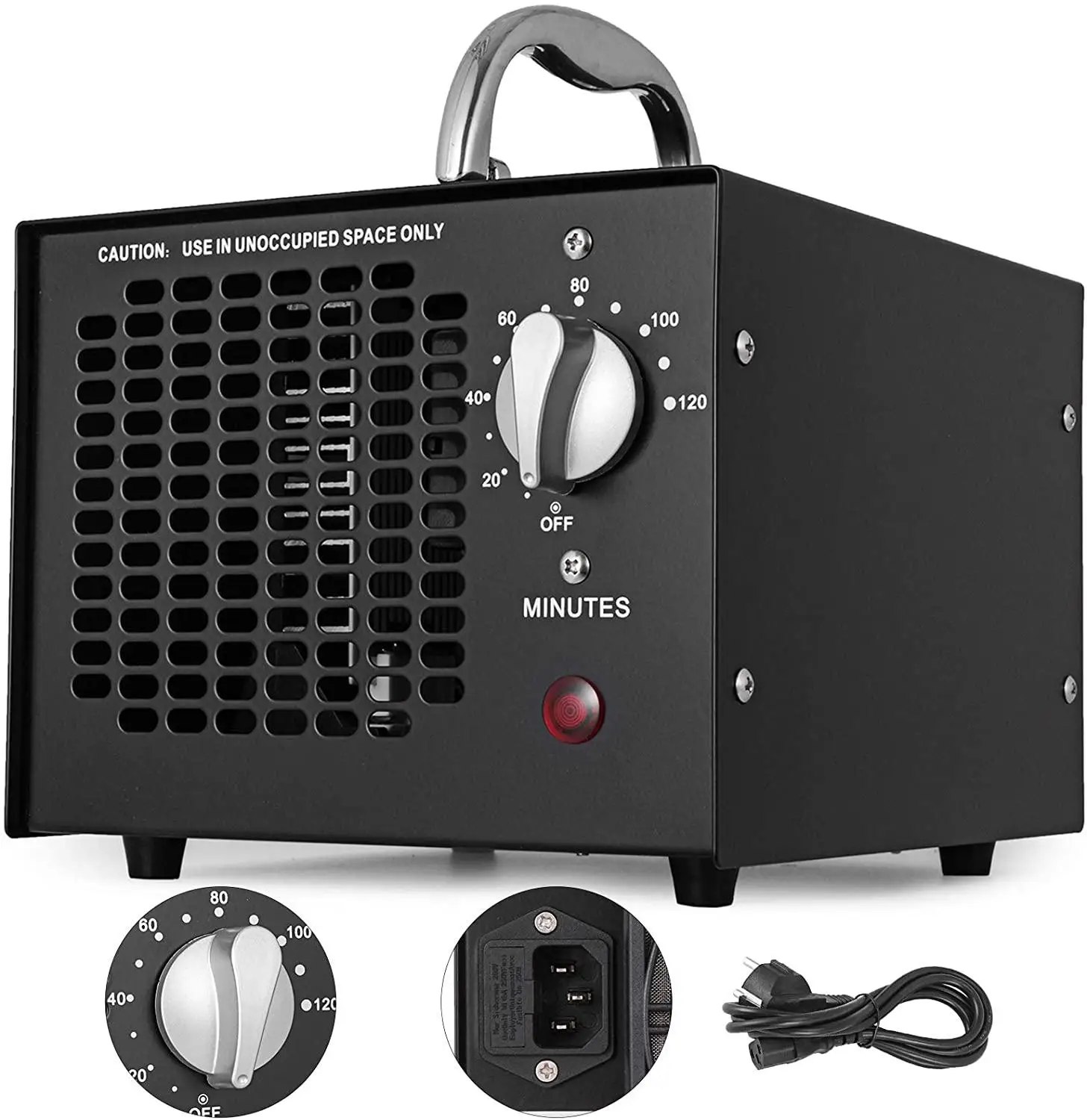 【Простота в эксплуатации-генератор озона имеет таймер с ручкой управления. Рабочее время можно регулировать до 2 часов; Источник питания предотвращает повреждение провода. Ручка из нержавеющей стали легко переносится и перемещается.