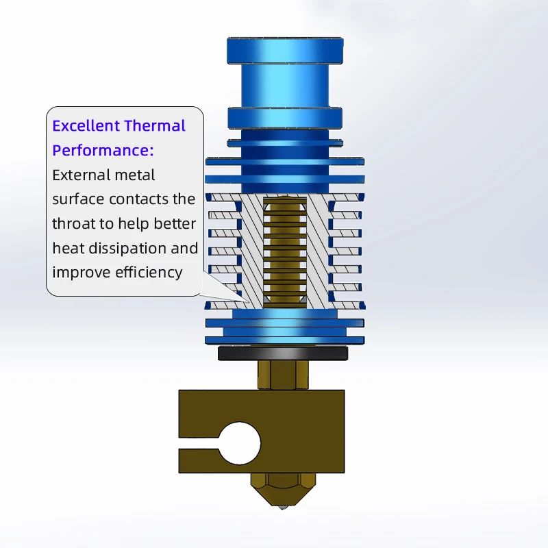 Это металлическая горловина из чистой меди и нержавеющей стали. Медь как отличный теплоотводящий материал, может быстро рассеивать тепло и проводить тепло. Труба из нержавеющей стали имеет отличный теплоизоляционный эффект. Положение трубки горла близко к соплу реализует небольшой дизайн высоты. По сравнению с оригинальной трубкой для горла, настроенной из нержавеющей стали и тефлоновой трубки, этот Горячий Конец может эффективно увеличить скорость печати и подходит для более широкого диапазона печати.