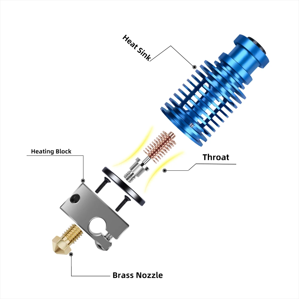 1 х латунный нагревательный блок 1x покрытием Медь Насадка (1,75 мм нити 0,4 мм) 1x V6 радиаторный радиатор 1x двойное металлическое горло (все металл, медь и нержавеющая сталь) 1 тефлоновая трубка (1 метр в длину, случайный цвет) 1x силиконовый чехол (подарок)Комплект"V6 SET 4"Включает: