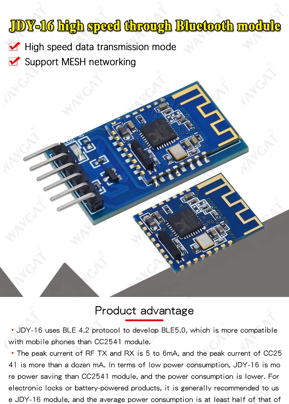 В JDY-16 Прозрачная передача модуль основан на Bluetooth-Совместимость с операционными 4,2 стандартный протокол Рабочая частота ремешок делает ношение неудобным 2,4 ГГц Диапазон, метод модуляции является GFSK, максимальная мощность передачи является 0db, максимальное расстояние передачи составляет 60 метров, И он принимает импортированный оригинальный дизайн чипа и поддерживает пользователей для изменения устройства через команды по имени, сервису UUID, мощности передачи, паролем сопряжения и другим инструкциям, удобны и гибки в использовании. JDY-16 модуль, совместимый с Bluetooth, может осуществлять передачу данных между модулем и мобильный телефон или между модулем и модулем. Режим связи UART или IIC может быть выбран через IO, и BLE Bluetooth-совместимый может быть быстро использован для приложения продукта через простую конфигурацию. Сделать ПРИМЕНЕНИЕ BLE в продуктах быстрее и удобнее