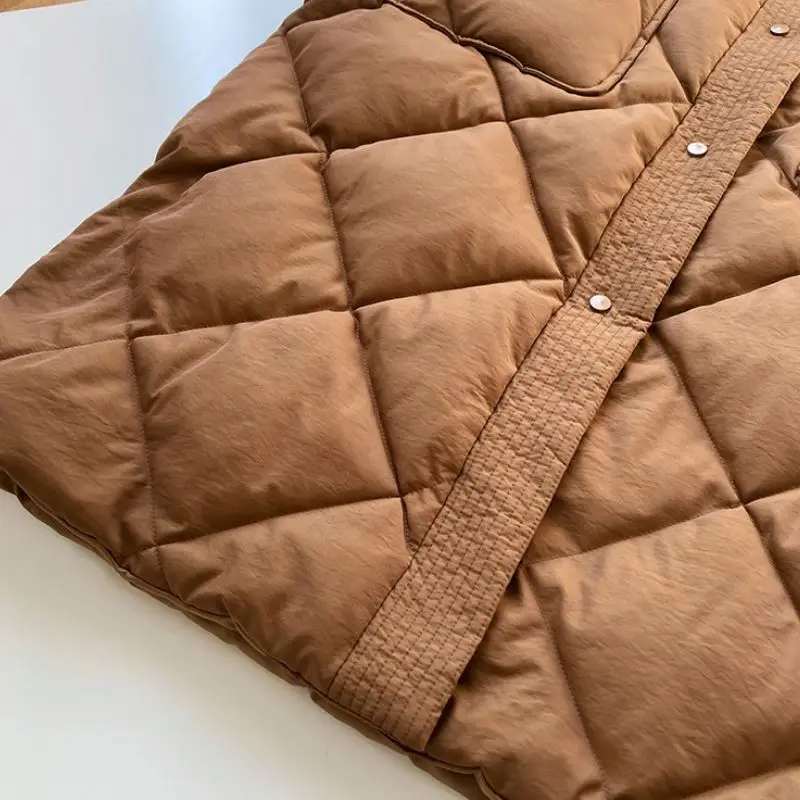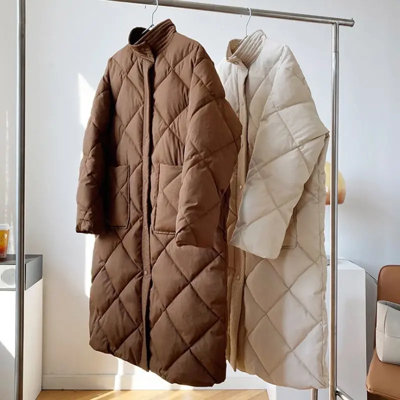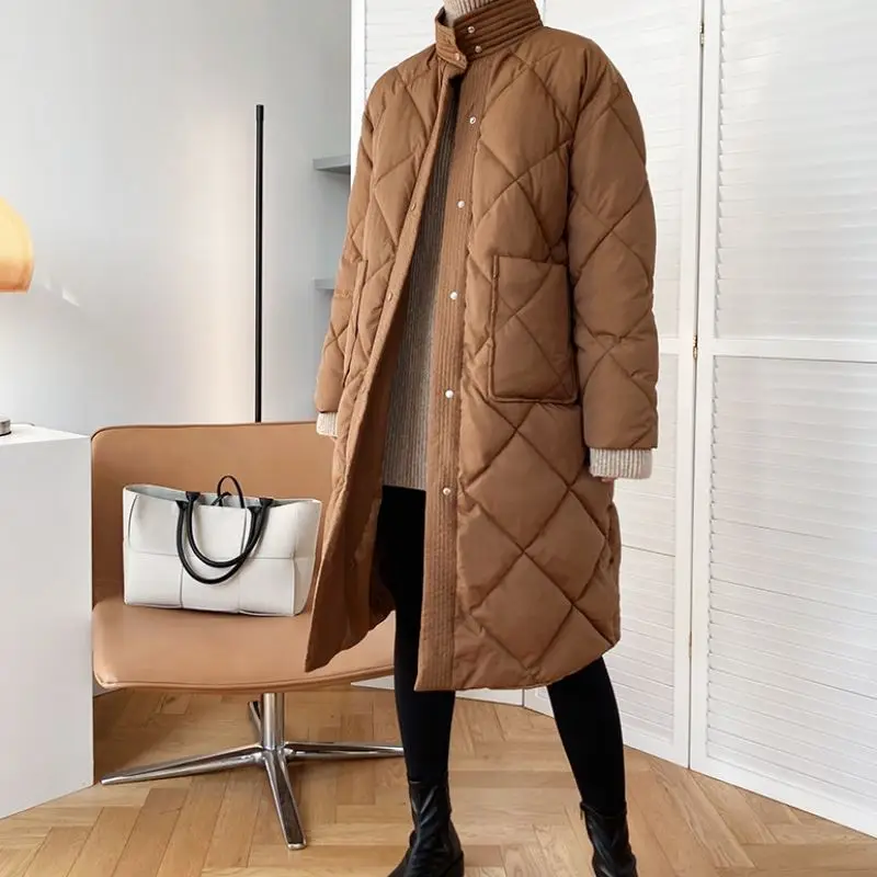EleeMee Winter Coat For Women Rhombus Pattern 2022 Warm Long Jacket Turtleneck Pocket Sashes Casual Female Parkas Size M-L Женская - купить