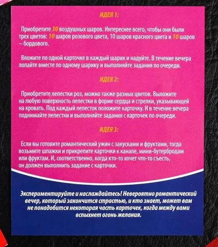 У вас намечается незабываемое романтическое свидание с партнёром? Тогда берите эту игру, добавляйте несколько идей, которые вы найдёте внутри, и превратите этот вечер в такой, что запомнится надолго. Ночь, полная страсти! Разрежьте карточки по пунктирным линиям. У вас получится три колоды - розового, красного и бордового цветов. Начните с розовых - вытягивайте их по очереди и выполняйте задания. Затем переходите к красным, более жарким картам, и, наконец, к бордовым. Воплотите в жизнь эти идеи, и ваша ночь будет незабываемой! В комплекте: 10 карт, правила игры.