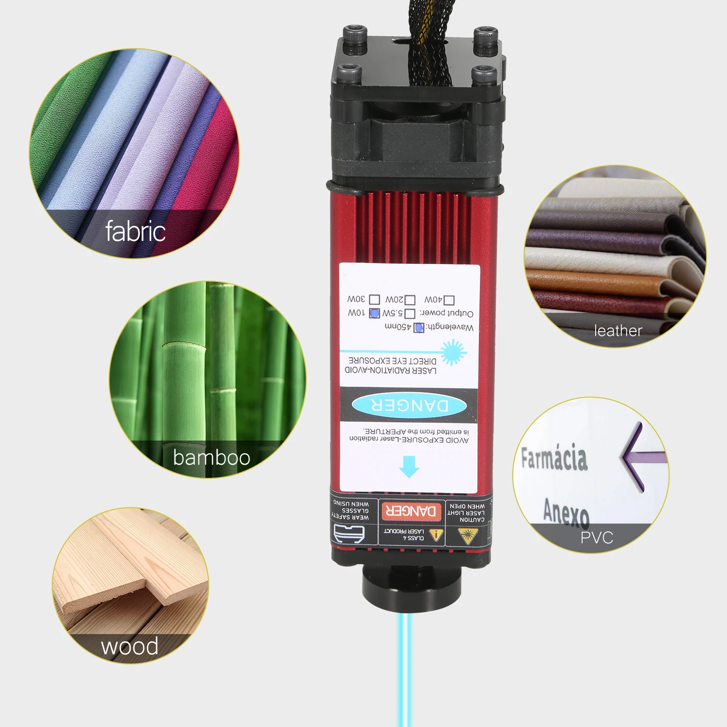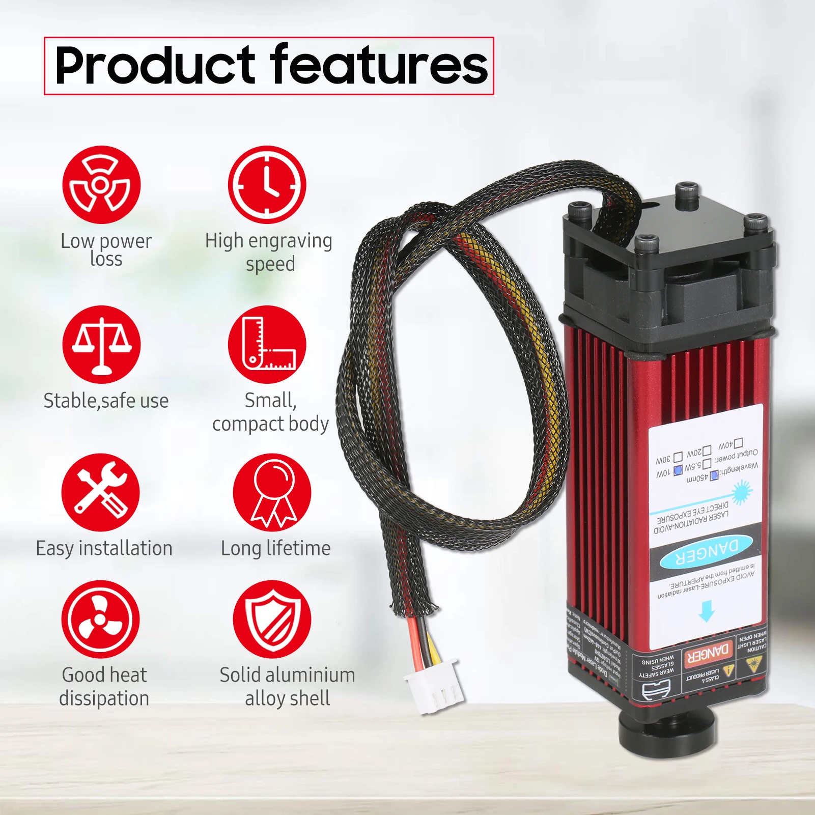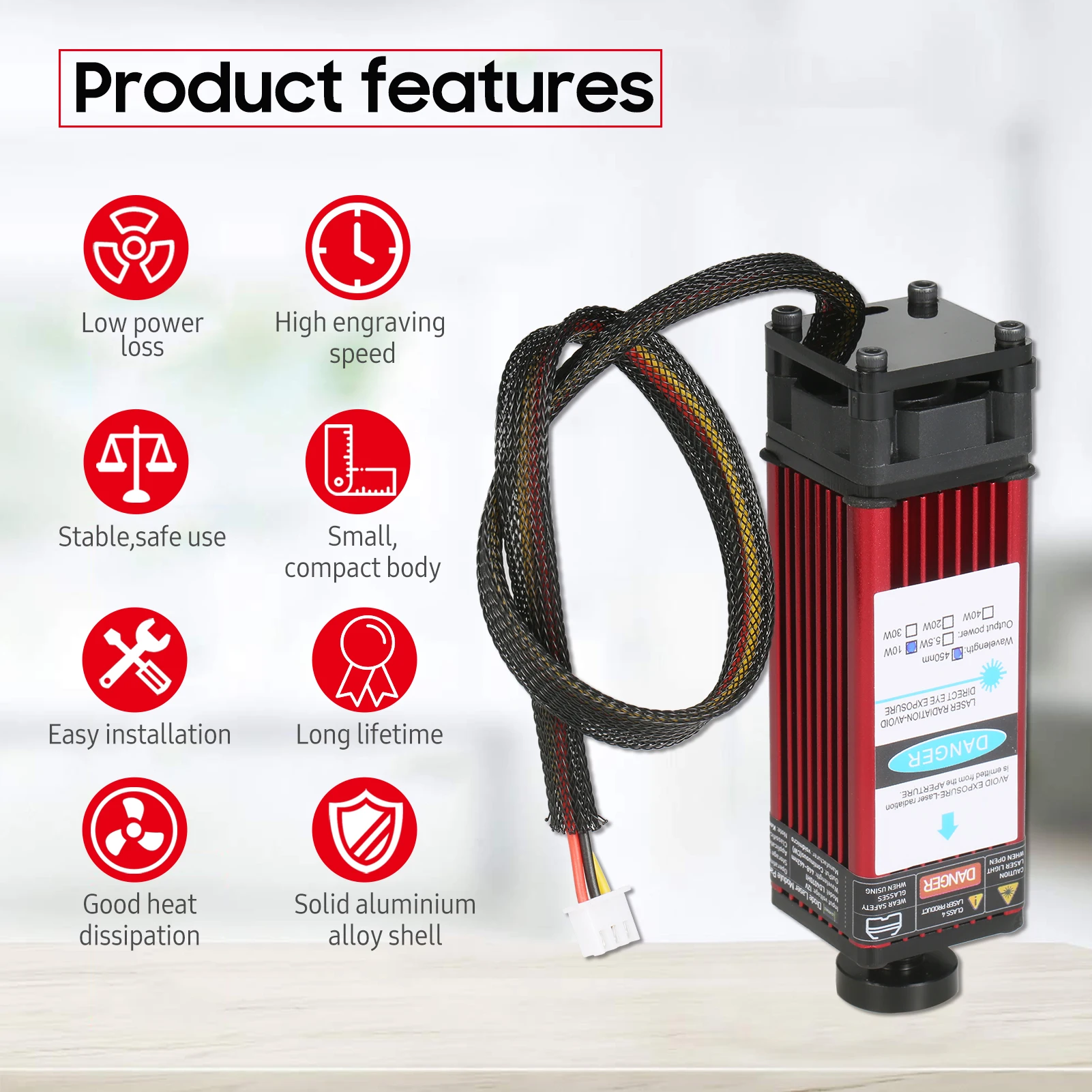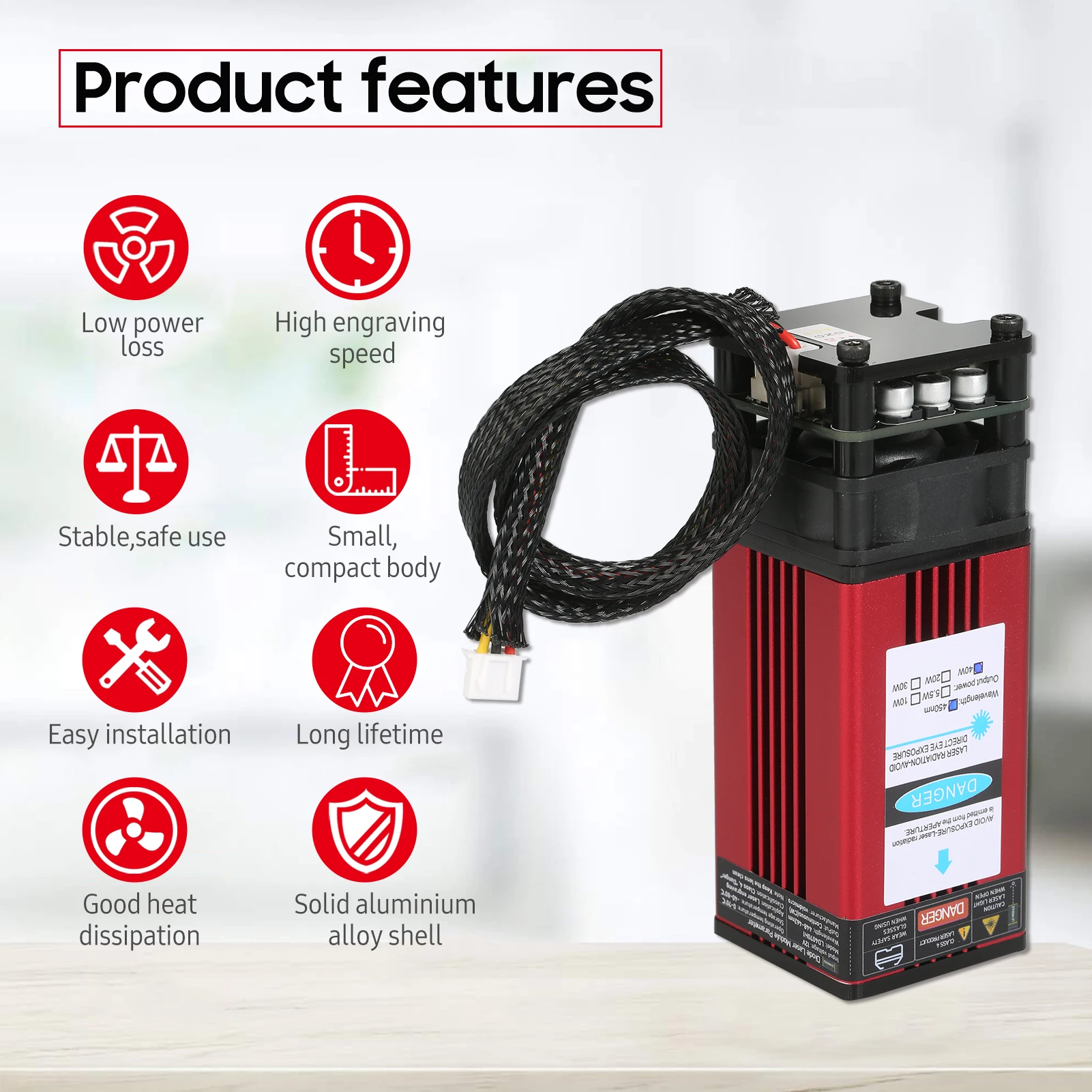 Профессиональный лазерный модуль, простой в установке, с более низкой потерей, обеспечивает длину волны 450нм, для эффективной, точной гравировки и резки пластика, дерева, бумаги и так далее, подходит для широкого спектра гравировальных машин.