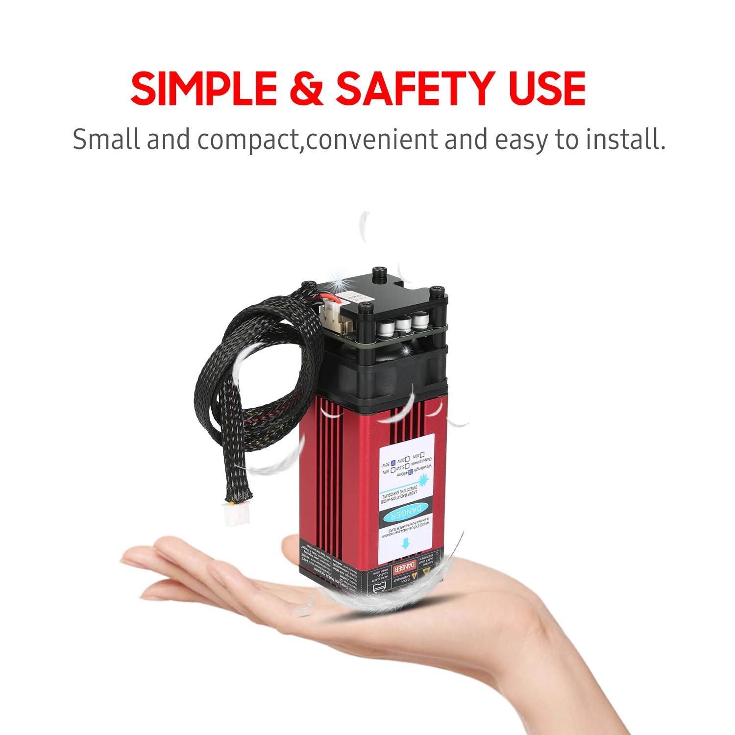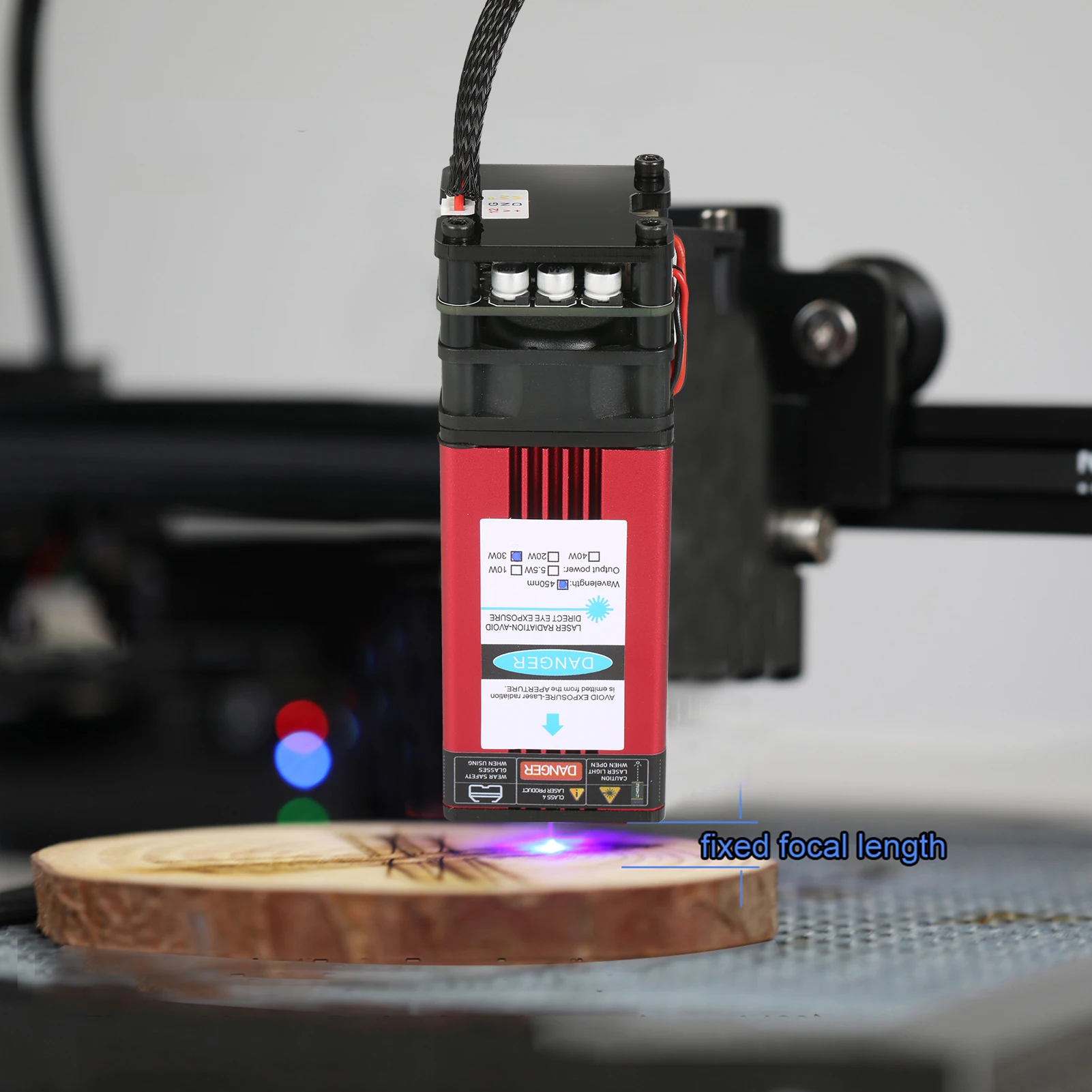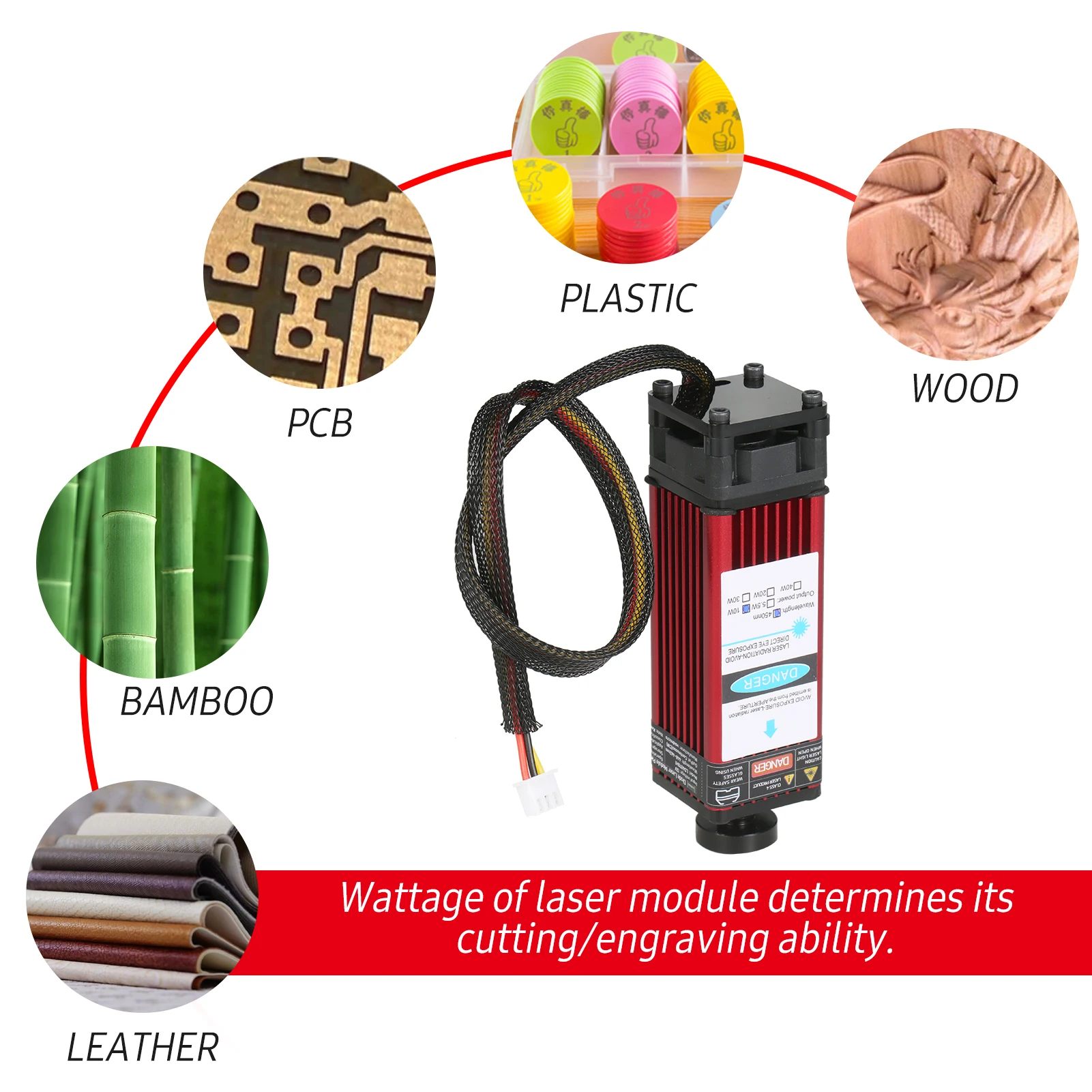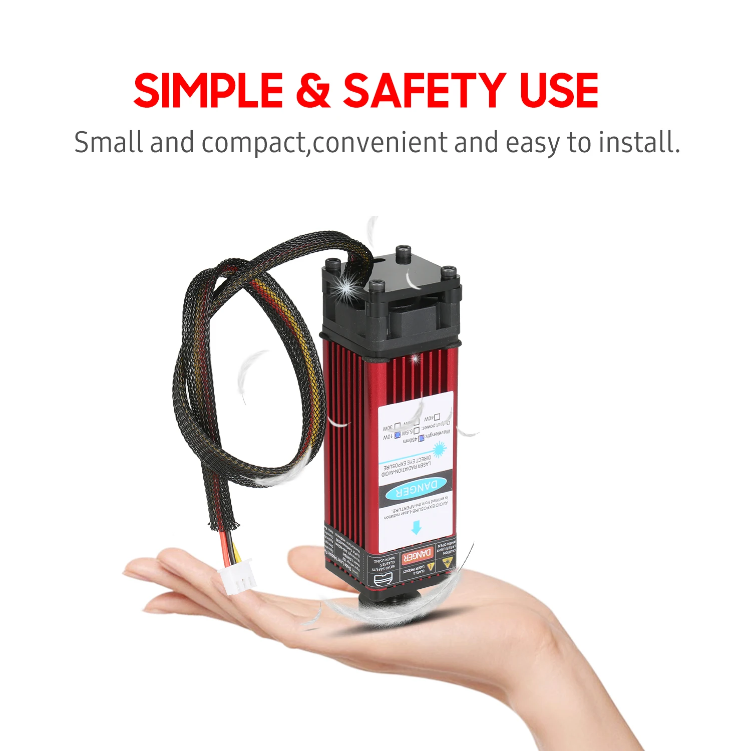 Профессиональный лазерный модуль, простой в установке, с более низкой потерей, обеспечивает длину волны 450нм, для эффективной, точной гравировки и резки пластика, дерева, бумаги и так далее, подходит для широкого спектра гравировальных машин.