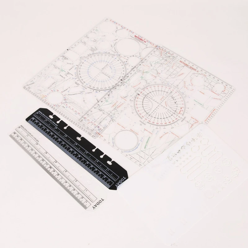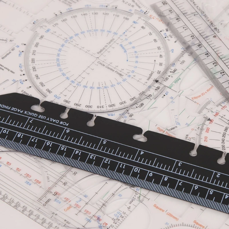 Профессиональный многофункциональный дизайн. Этот шаблон для рисования разработан с различными размерами выдолбленных шаблонов, таких как круг, треугольник isosceles, трапециевидный, параллелограмма, транспортир, квадрат, квадрат, Шестигранник, Пентагон, кривая и т. Д. Идеально подходит для художественного рисунка DIY, геометрического рисунка и т. д.