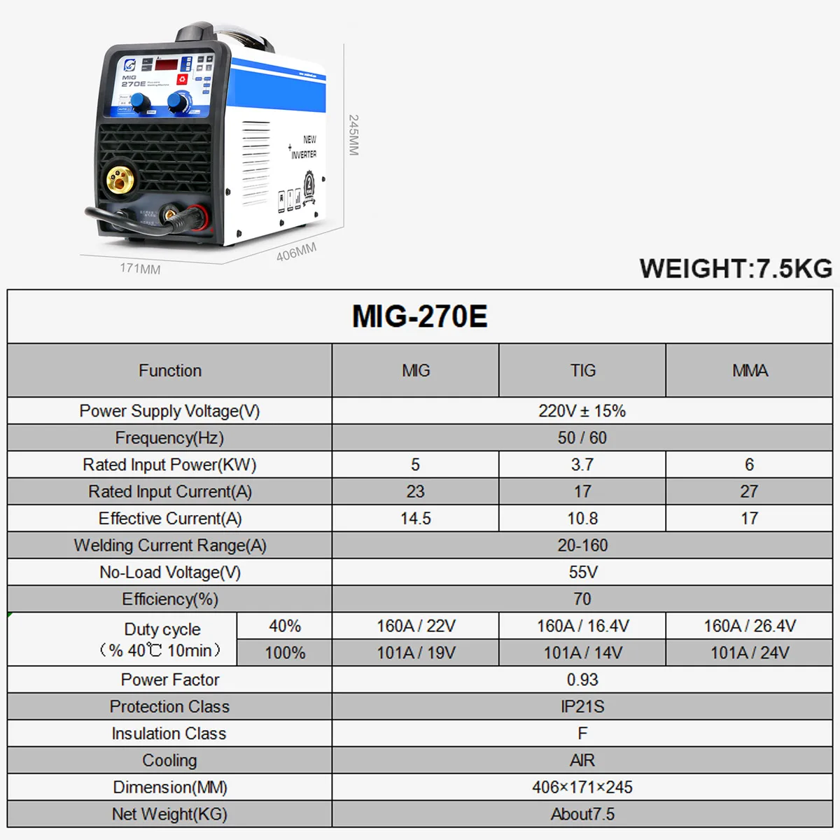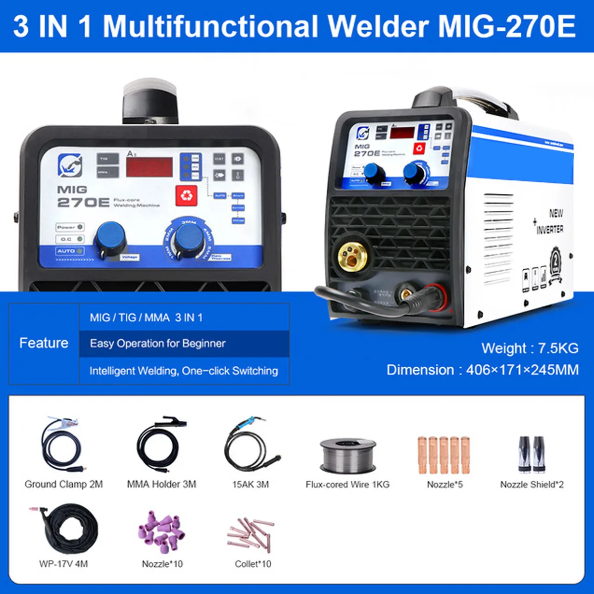 MIG-270E MIG/LIFT TIG/MMA 3 в 1 Многофункциональная портативная интеллектуальная сварочная машина без газовых сварщиков IP21S 220V EU Plug