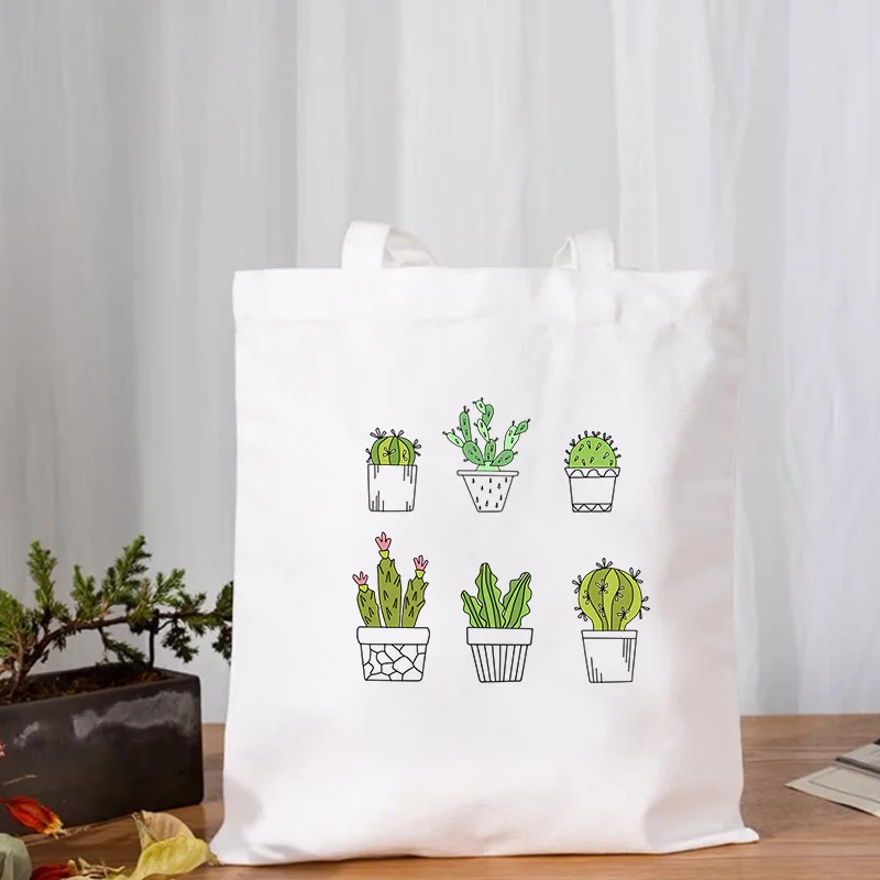 Aesthetic Kawaii Women tote bag cactus Print Shopper White Casual Summer lady shopping Girl books bags Багаж и сумки - купить
