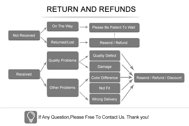Если возникнут какие-либо проблемы с товарами, которые вы купили, мы произведем обмен или вернем оплату товара (стоимость доставки и обработки не включены) в течение 60 дней после подтверждения получения товара.