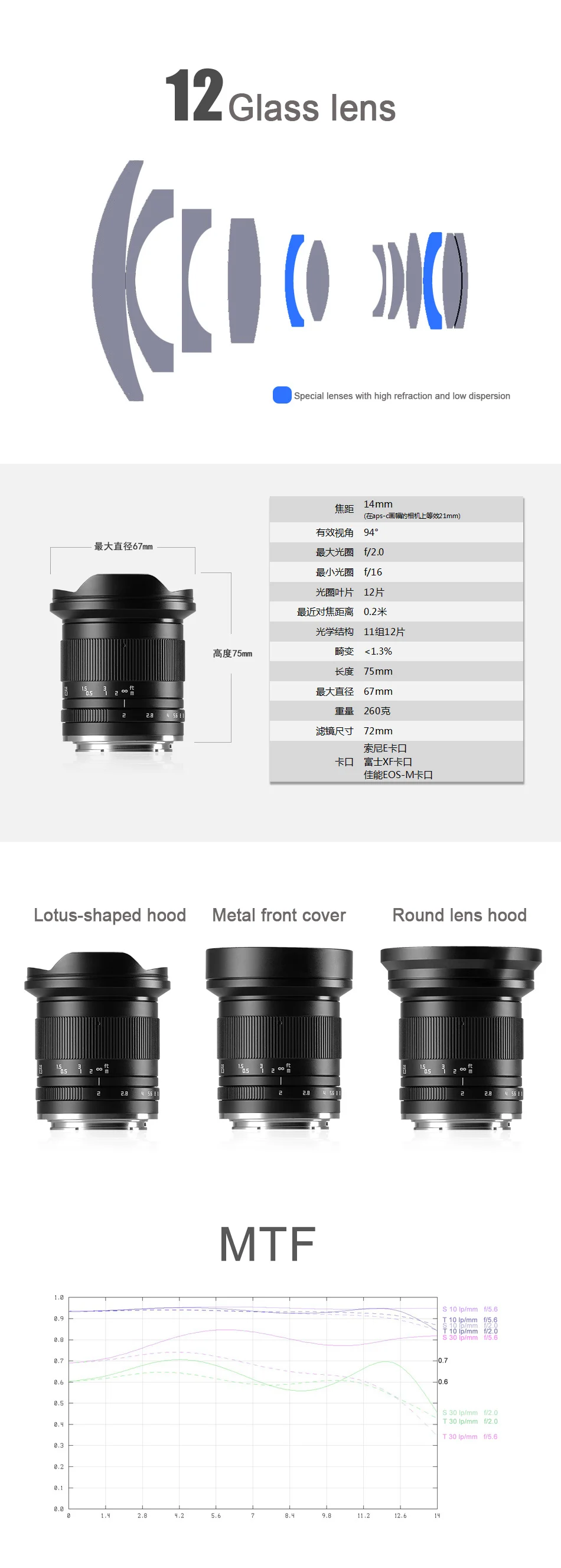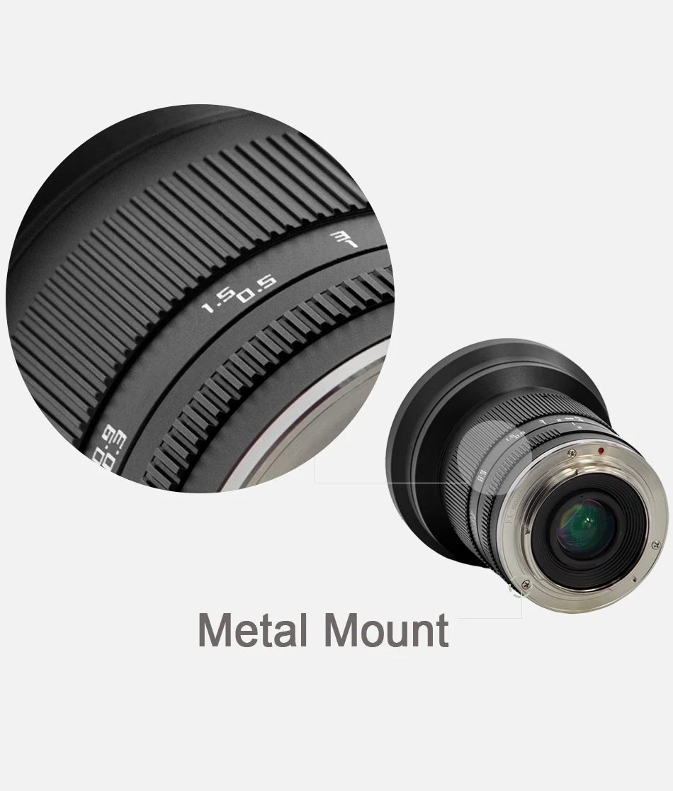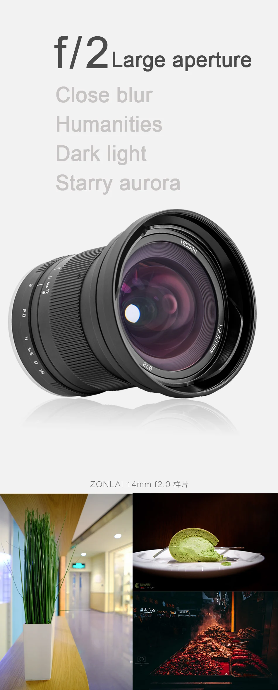 2. Zonlai 14 мм f2 ультра широкоугольный объектив ручной фокусировки, он совместим с камерой формата APS-C. Когда он используется с камерой формата APS-C, его угол обзора 94 °, диапазон диафрагмы f/2-f/16.