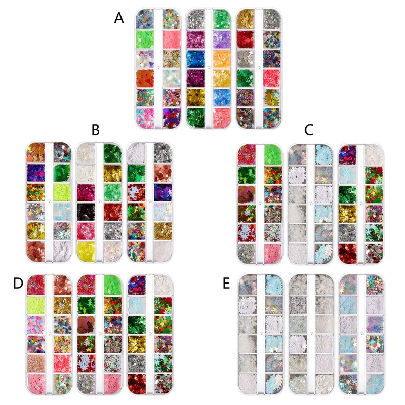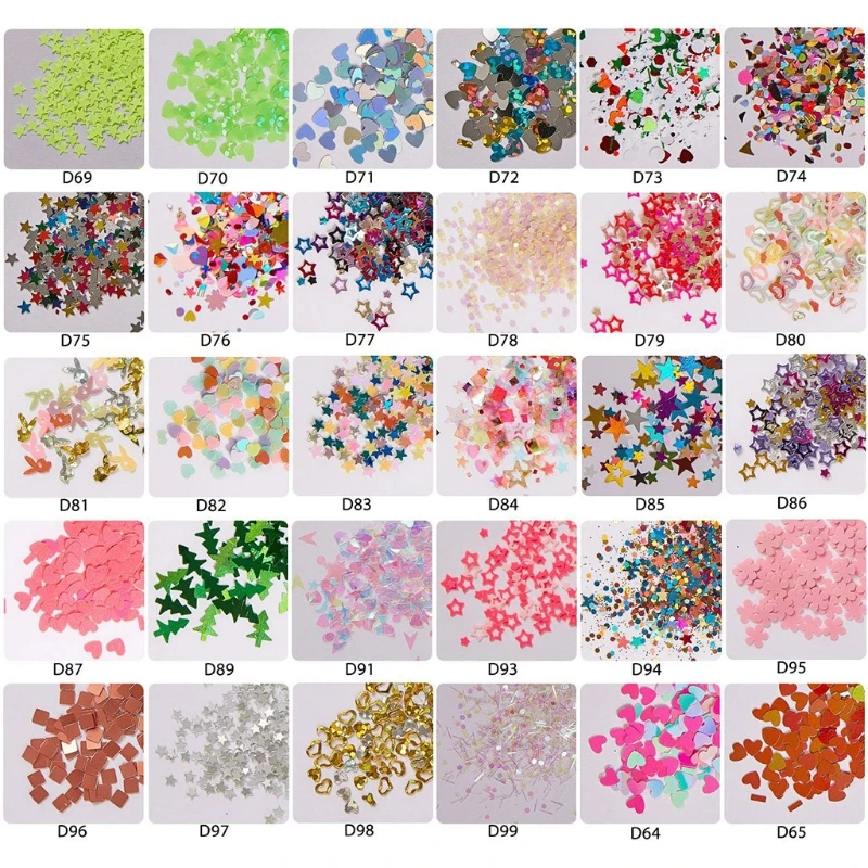 Различные стили: Рождественская тематика, звезда, сердце, Бабочка, круг, неправильной формы, прямоугольник, полое сердце, полая звезда, снежинка, Луна и т. д. Они демонстрируют блестящий цвет, когда видны под разными углами и светом, делают ваши ногти блестящими и очаровательными.