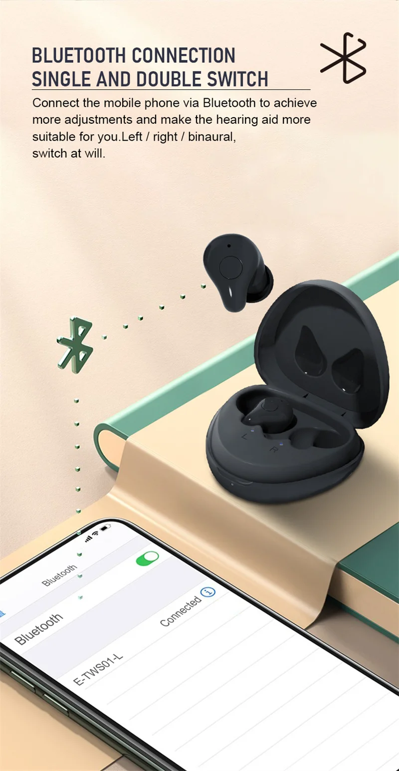 3. Изысканный и маленький дизайн, одна пара черных мини-аппаратов heairng, вы можете использовать в качестве наушников, вы можете подключить телефон для прослушивания музыки, телефонных звонков и т. Д.
