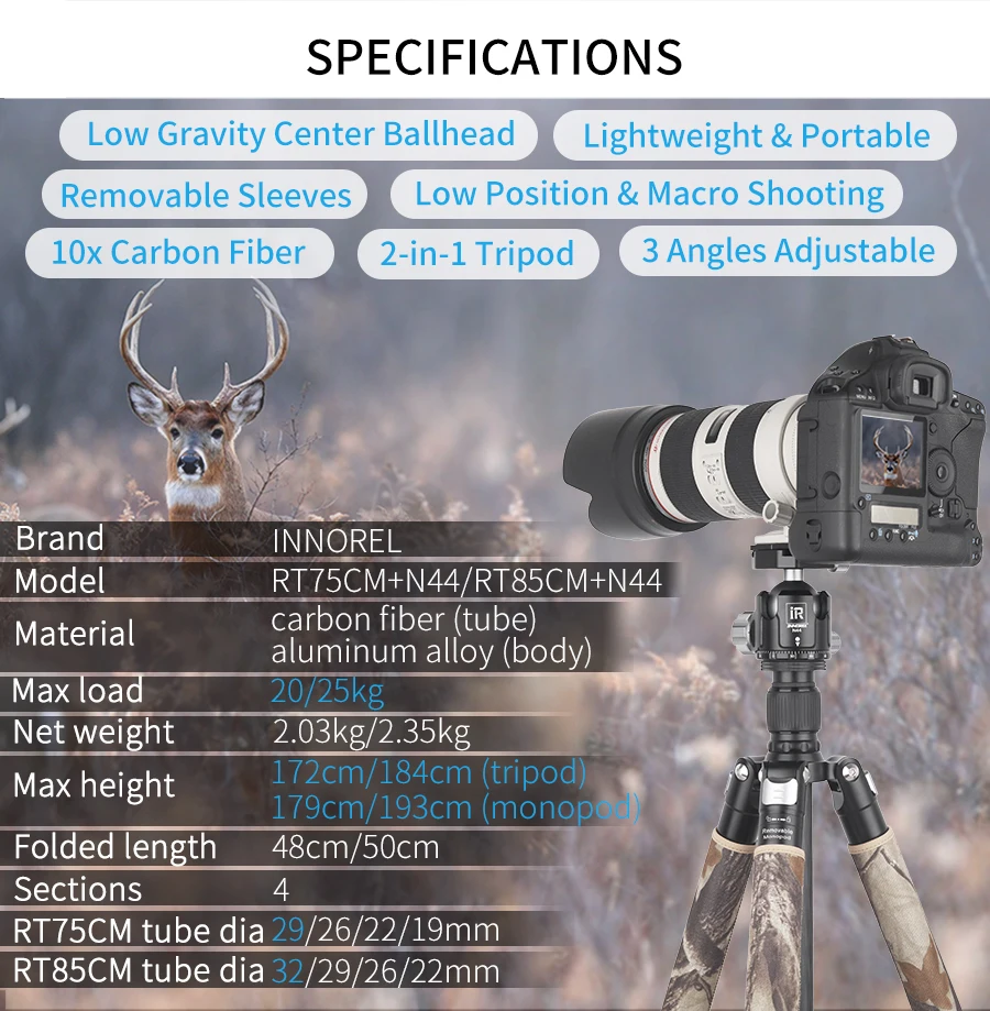 Отзывы о INNOREL RT75CM/RT85CM Professional Carbon Fiber Tripod Monopod for DSLR Camera Heavy Duty Stand Panoramic Low Gravity Ball Head