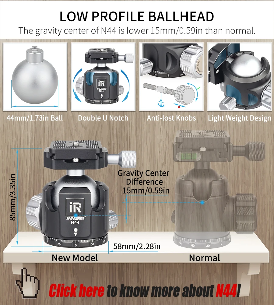 【LOW GRAVITY CENTER】 The ballhead is designed with low gravity center and double U notch, the structure is more compact and reliable. CNC machining and 44mm/1.73in large ball diameter make it extremely stable. |