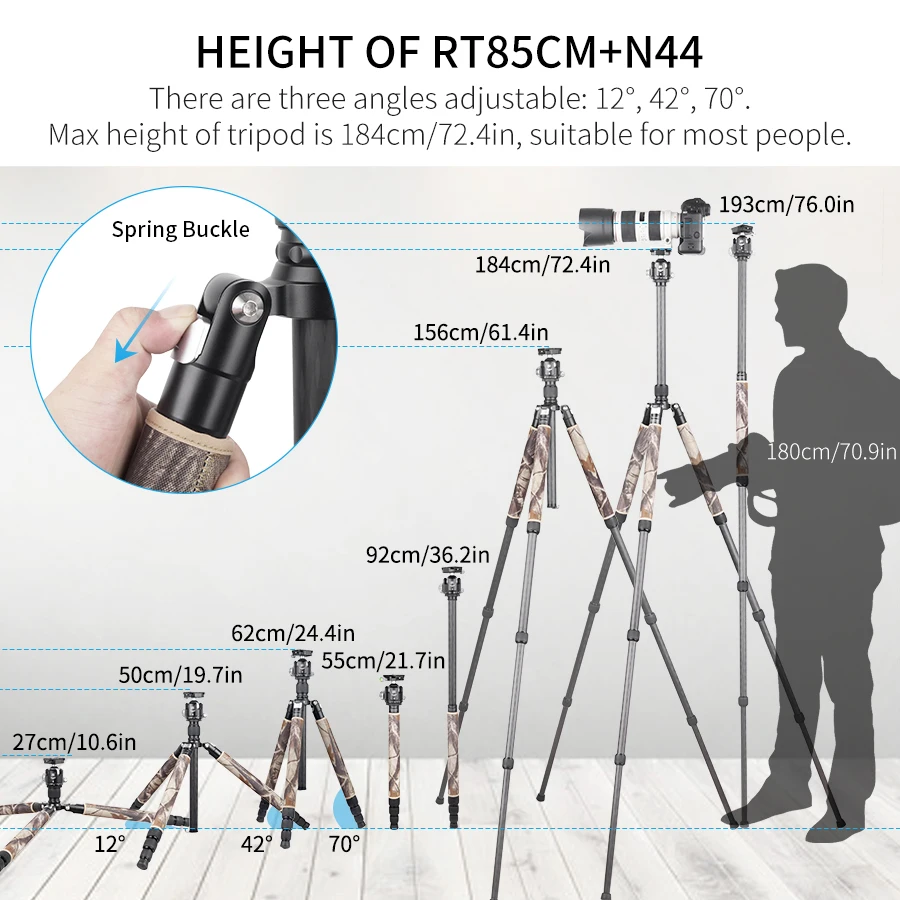 【ADJUSTABLE MULTIFUNCTIONS】 This tripod uses advanced twist lock system for fast and rock solid position setting, you can adjust three angles(70°/ 42°/ 12°) quickly. One of the legs can be removed then be a monopod or a alpenstock for hike. |