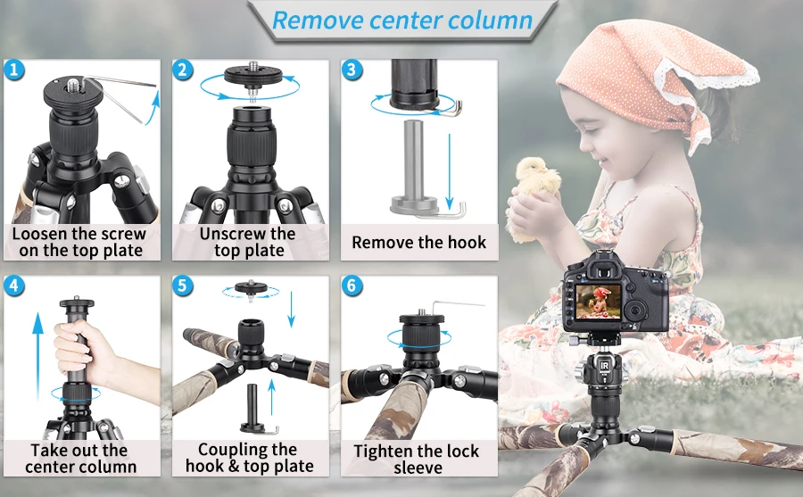 【EXCLUSIVE MID-COLUMN】You can remove or invert the mid-column to get a low position for camera, so that it can realize the lowest angling shooting, macro shooting, or other special photography. |