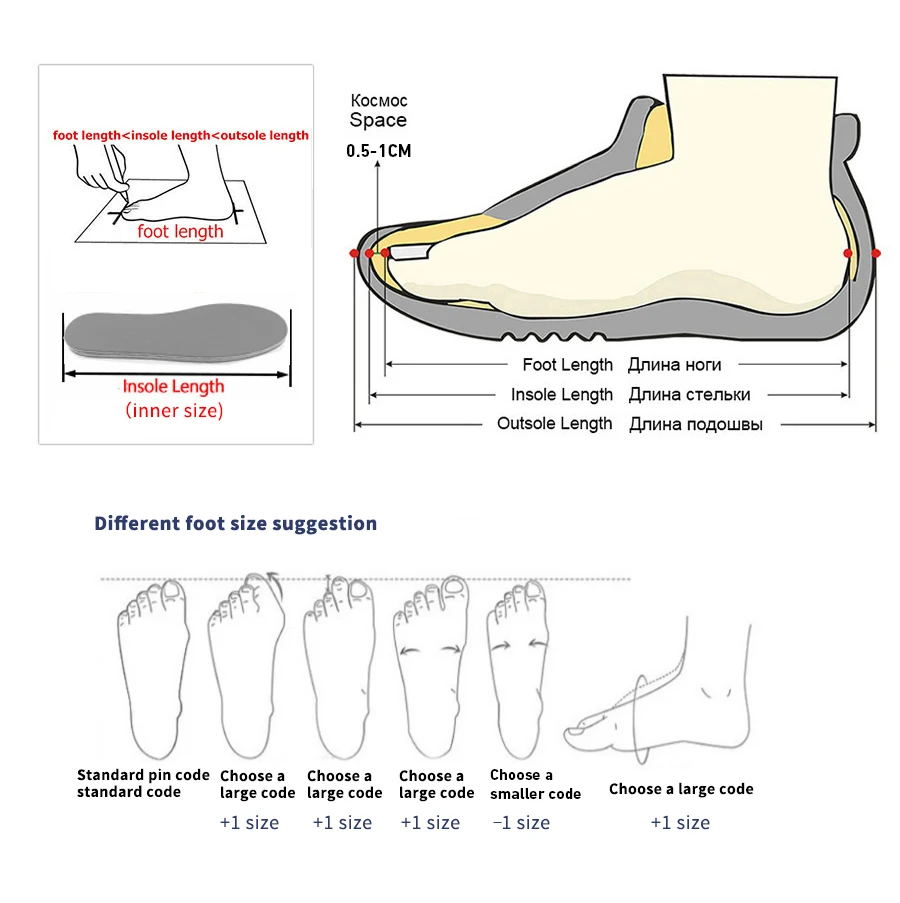 Как правило, внутренняя длина обуви-это 0,5 ~ 1 см длиннее, чем выбирайте размер по длине стопы, который подходит