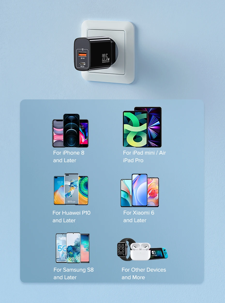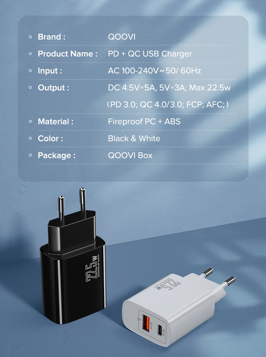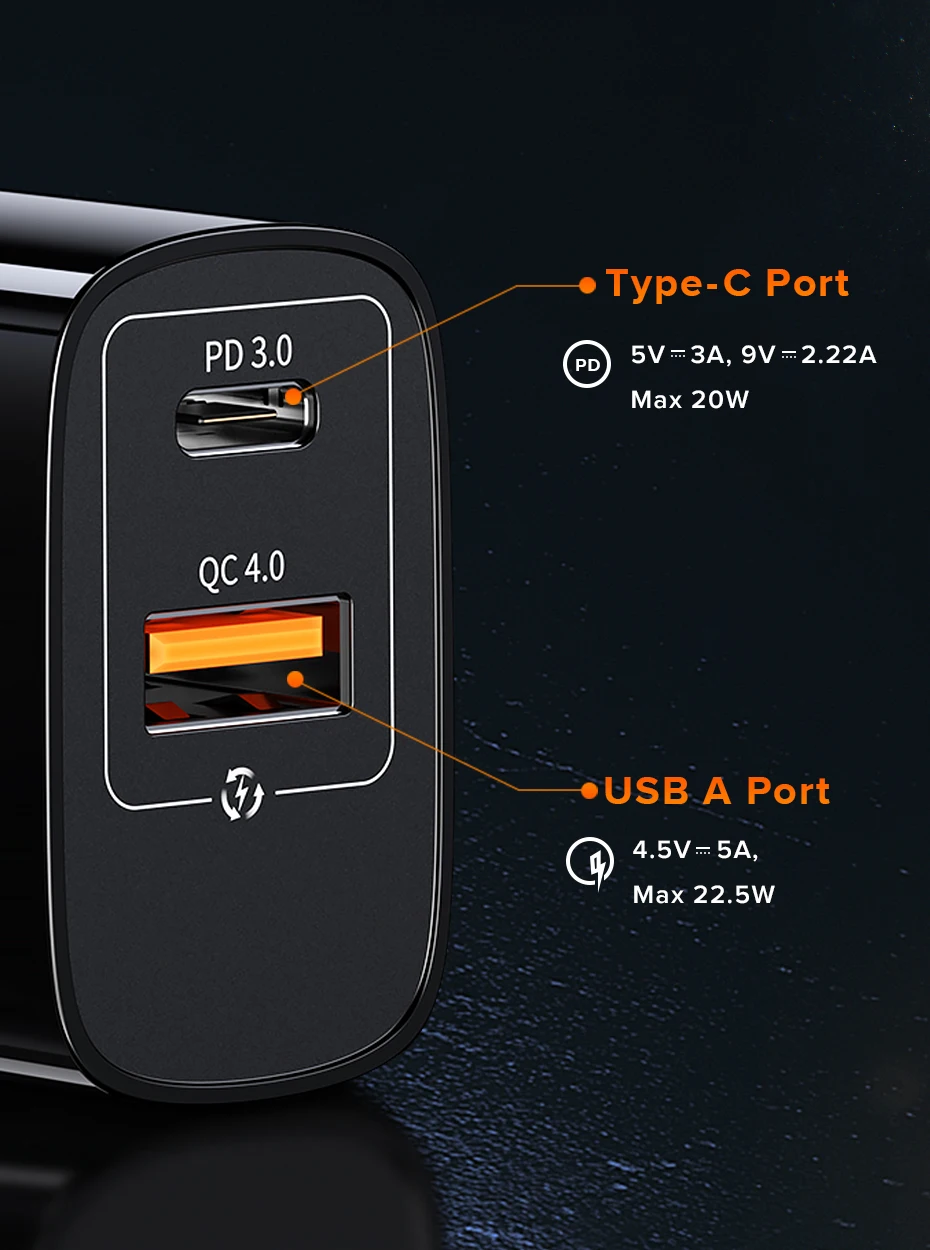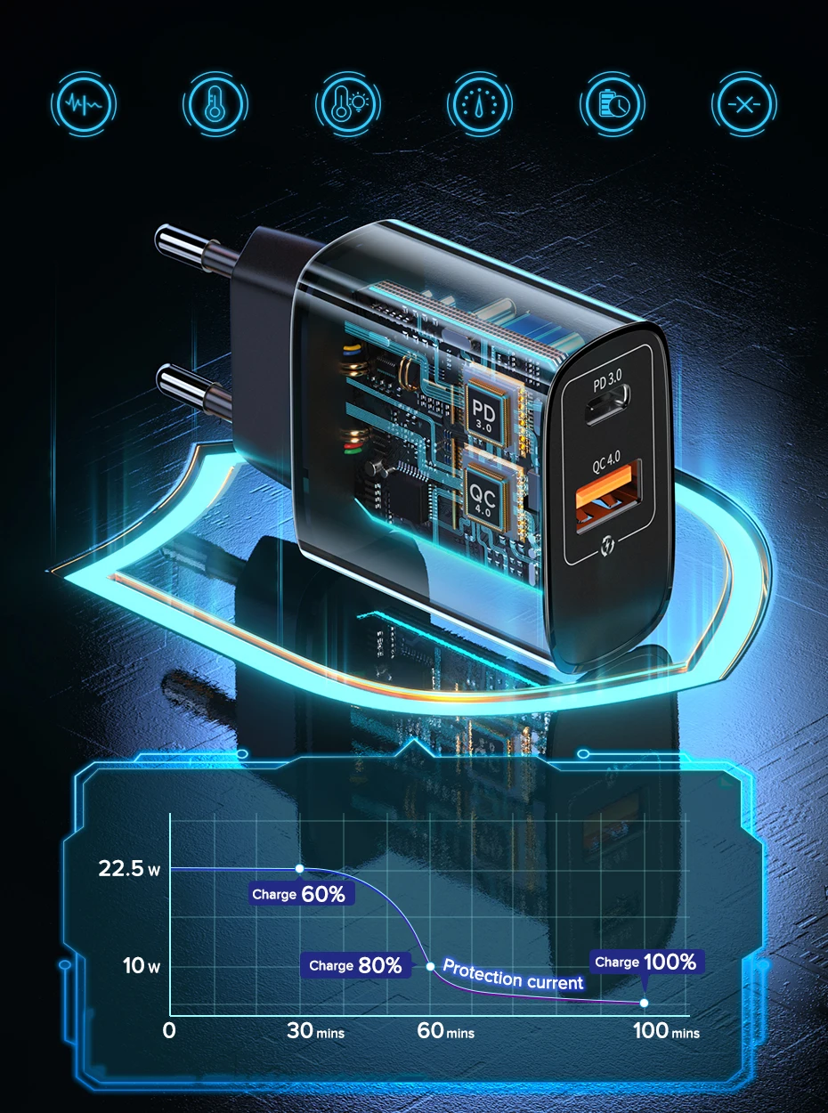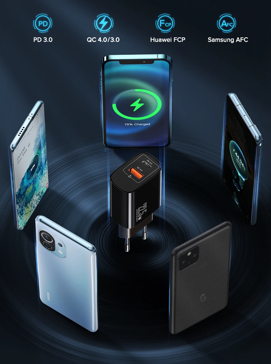 PD3.0(20 Вт)✔QC4.0 (22,5 Вт)✔Высокая эффективность✔Безопасный и прочный✔