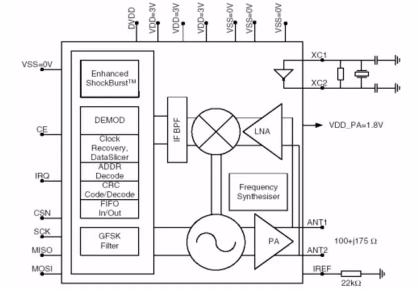 NRF24L01 представляет собой работы в 2,4-2,5 ГГц по всему миру ISM полоса однокристальный приемопередатчик "блок управления, беспроводной приемопередатчик, в том числе: генератор частоты регулятор режима шокбурстм усилитель кристаллический усилитель модулятор выбор вывода демодулятора и протокол, установленный SPI интерфейсом для установки очень низкого потребления тока, Более низкий режим потребления тока 12.3ма-режим понижения и режим ожидания, когда в режиме передачи излучение 6dBm, когда потребление тока составляет 9.0ма приемная модель.