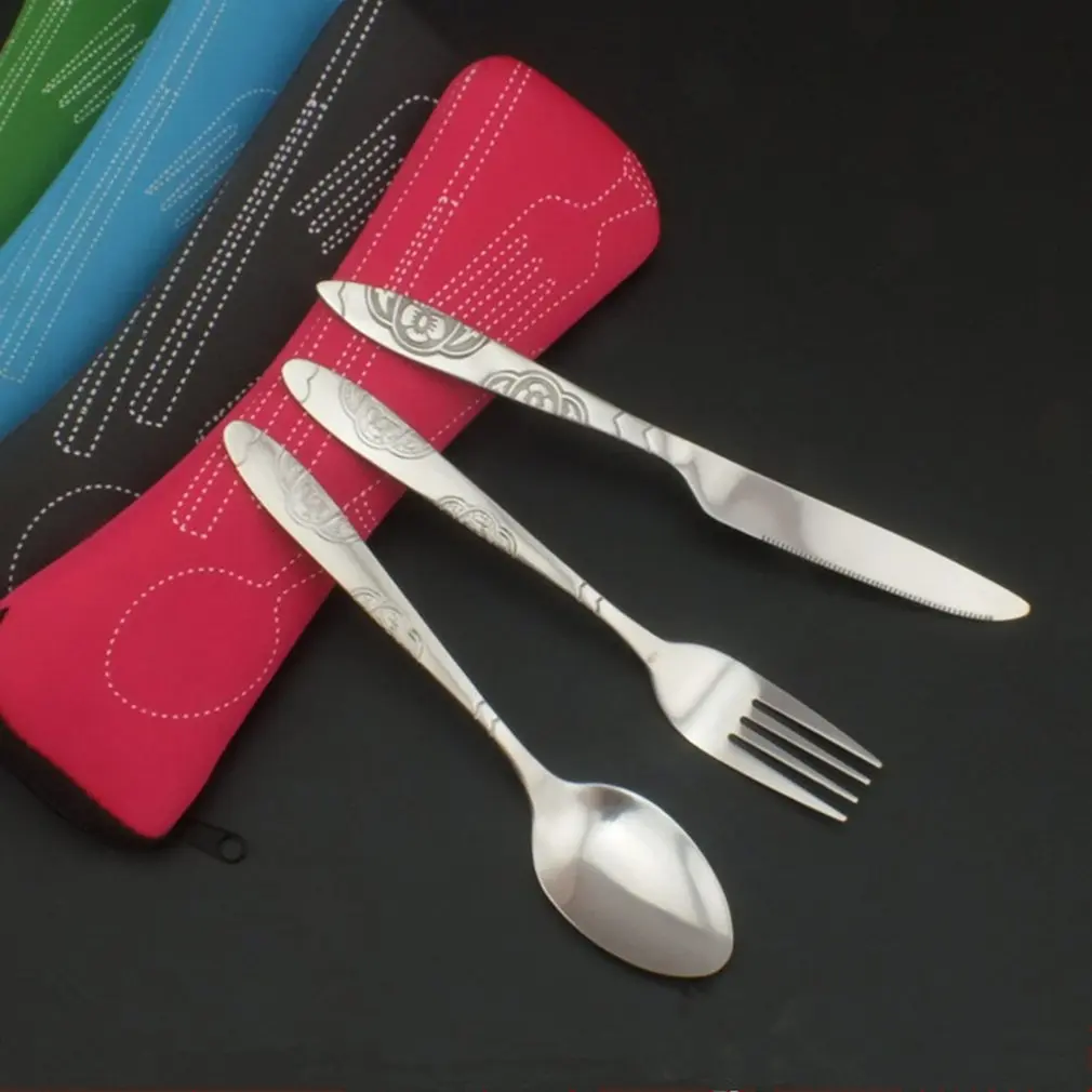 3 шт./набор, портативная ложка из нержавеющей стали, вилка, набор ножей для стейка, дорожные столовые приборы, посуда с сумкой, походная посуда, набор