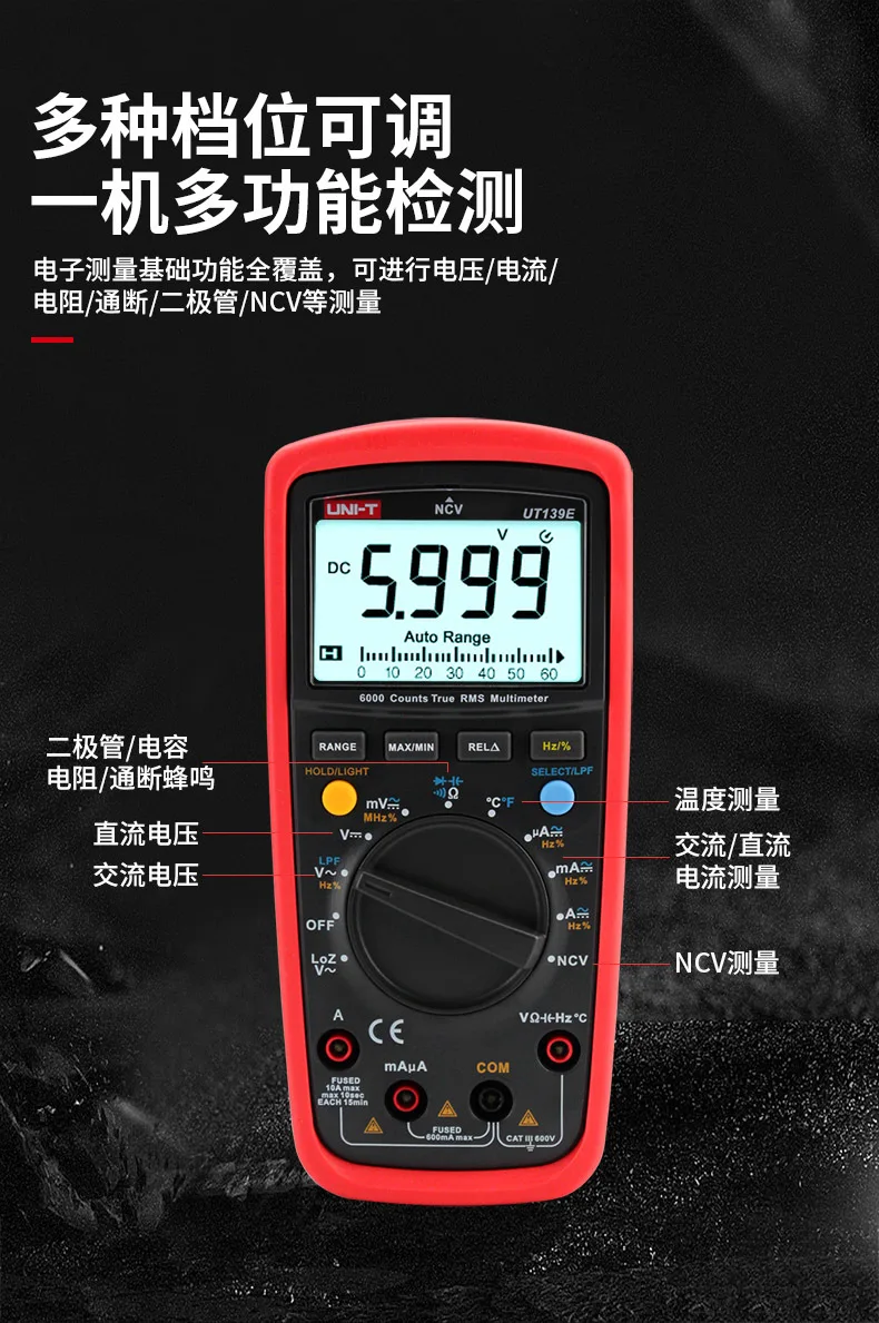 Серия UT139Цифровой мультиметр True RMSСерия UT139-Цифровые мультиметры CAT III 600V, предназначенные для электриков. Его функция NCV может эффективно проверять электрическое состояние путем измерения интенсивности поля EM. Новые модели UT139E/S включают специальные функции, такие как LoZ (ACV) для измерения напряжения ghost'. Его встроенный 31 в поп упаковке, аналоговая панель также дает электрики лучшее визуальное отображение результатов измерений. UT139S построен с черным дисплеем EBTN и является идеальным счетчиком для работы в темных условиях.Особенности1. Макс/мин/REL режимы2. Удержание данных, светодиодный индикатор подсветки, Автоматическое отключение питания3. Полная защита диапазона (600 В)4. True RMS5. NCV6. Выбор автоматических/ручных диапазонов