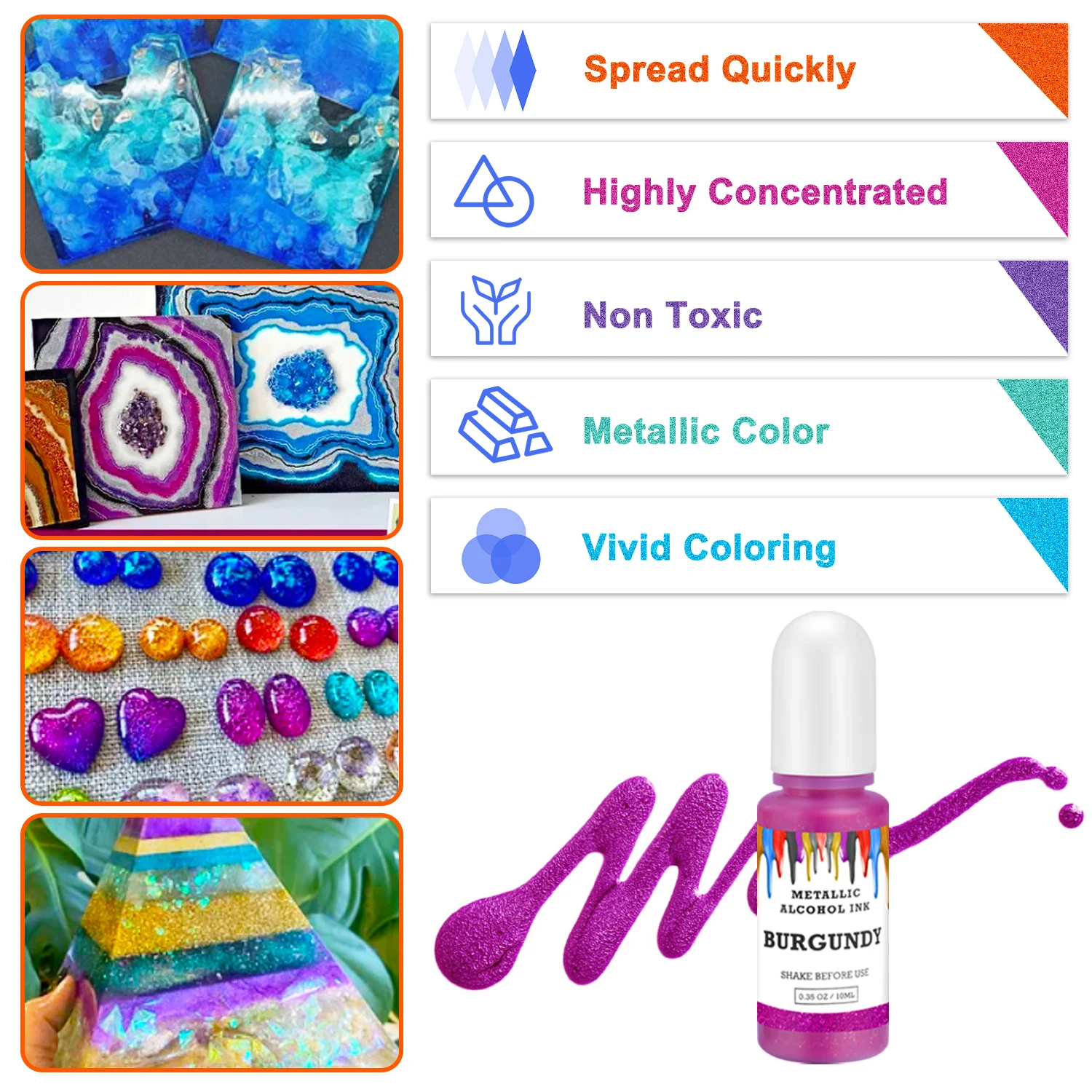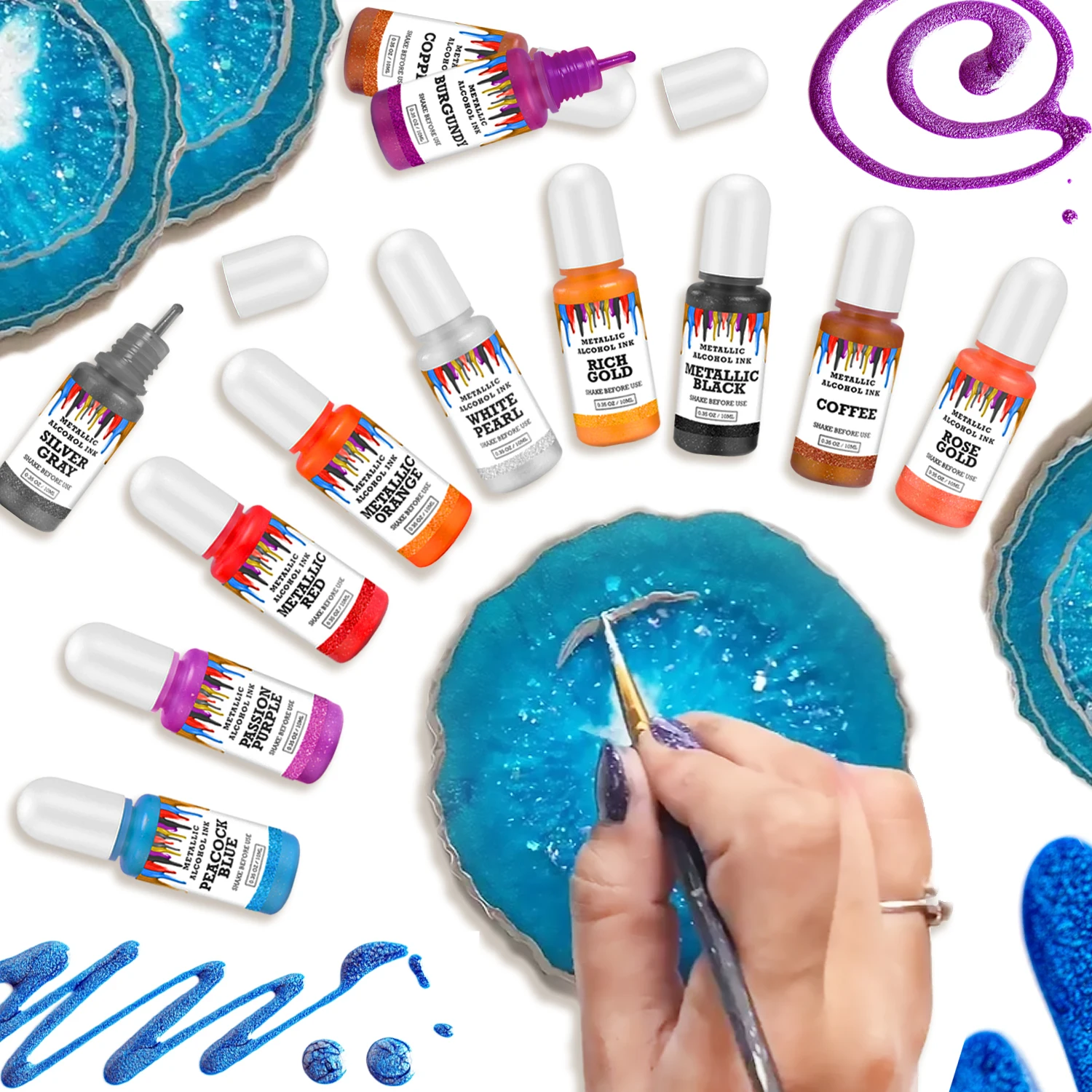 Металлические спиртовые чернила обеспечивают Сияющие яркие цвета для каждого художественного проекта, такие как эпоксидная смола искусство, эпоксидная смола живопись, смолы вихрь, смолы пульсации, смолы Петри блюдо делая, смолы налить искусство, подставки, стаканы делая, yupo бумага и другие алкогольные чернила искусства.