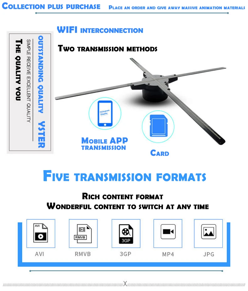 Поддержка MP4, формат с черным фоном. Вы можете использовать некоторые программы, такие как 3D maker ,Maya, чтобы сделать свои собственные 3D изображения, а затем перейти к формату bin.