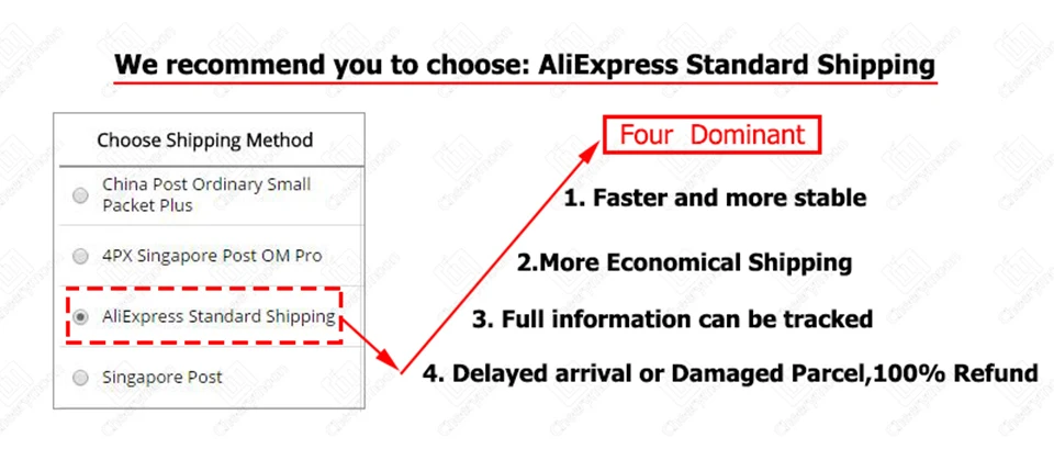 Если вы хотите лучшую защиту, пожалуйста, не выбирайте экономичную логистику. Экономическая логистика имеет 8%-15% шансов на недостающие товары, в противном случае это потеряет время. Выбор: AliExpress Стандартная доставка