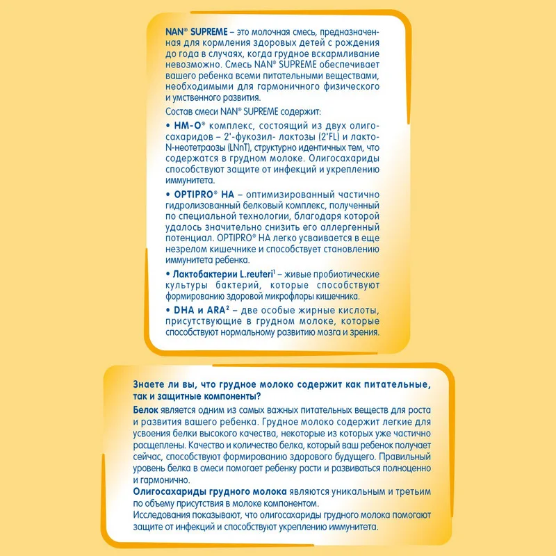 NAN® SUPREME - это молочная смесь, предназначенная для кормления здоровых детей с рождения до года в случаях, когда грудное вскармливание невозможно. Смесь NAN® SUPREME обеспечивает вашего ребенка всеми питательными веществами, необходимыми для гармоничного физического и умственного развития.