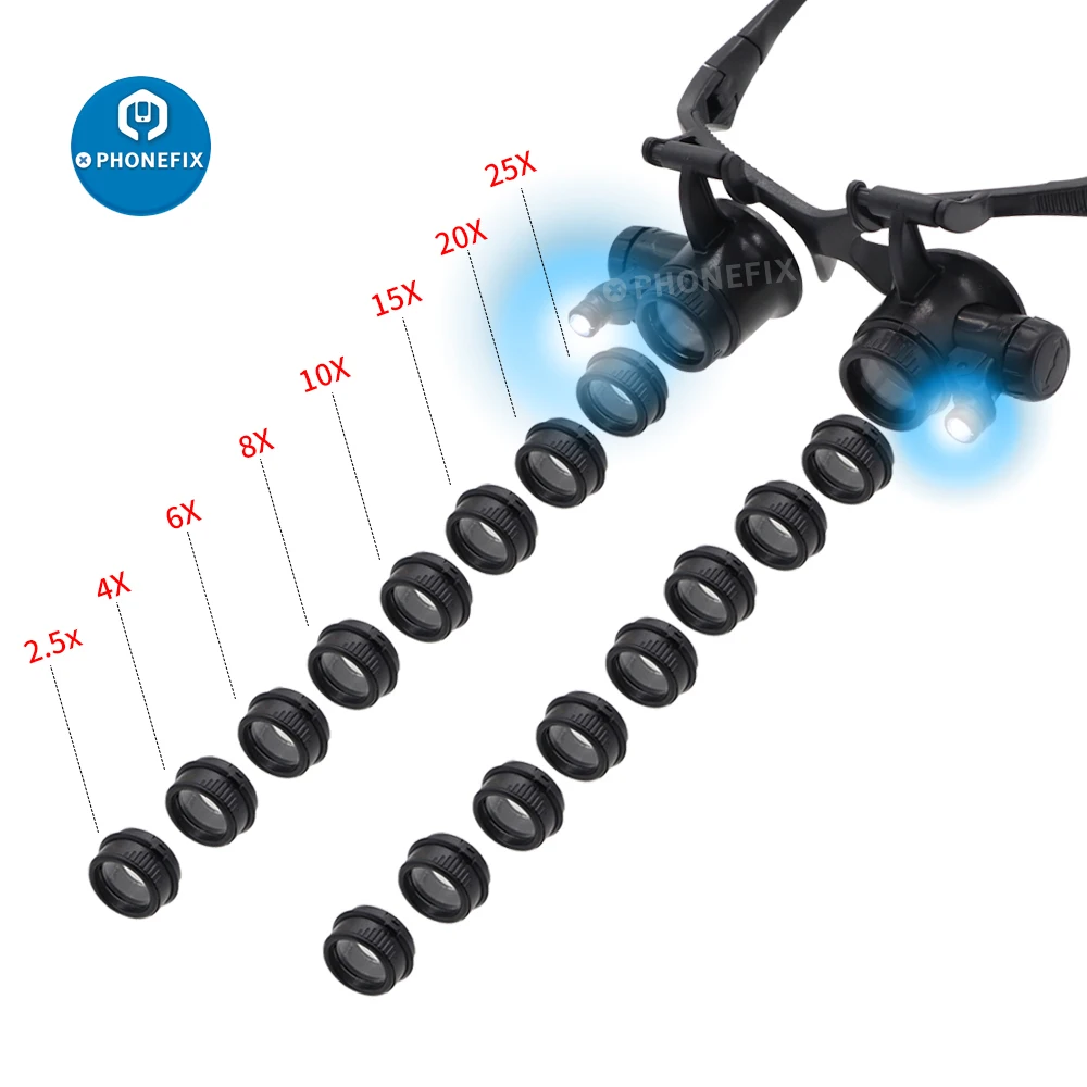 2.5X 10X 15X 20X 25X Регулируемая лупа для глаз Лупа очки для часов Мобильный ремонт телефона PCB головная повязка двойной светодиодный очки для глаз