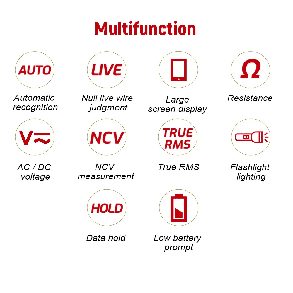 Возможность Тестирования постоянного/переменного напряжения, сопротивления, частоты, емкости, диодов, ВКЛ/ВЫКЛ цепи и предлагает NCV обнаружения, нейтральной и живой идентификации провода.