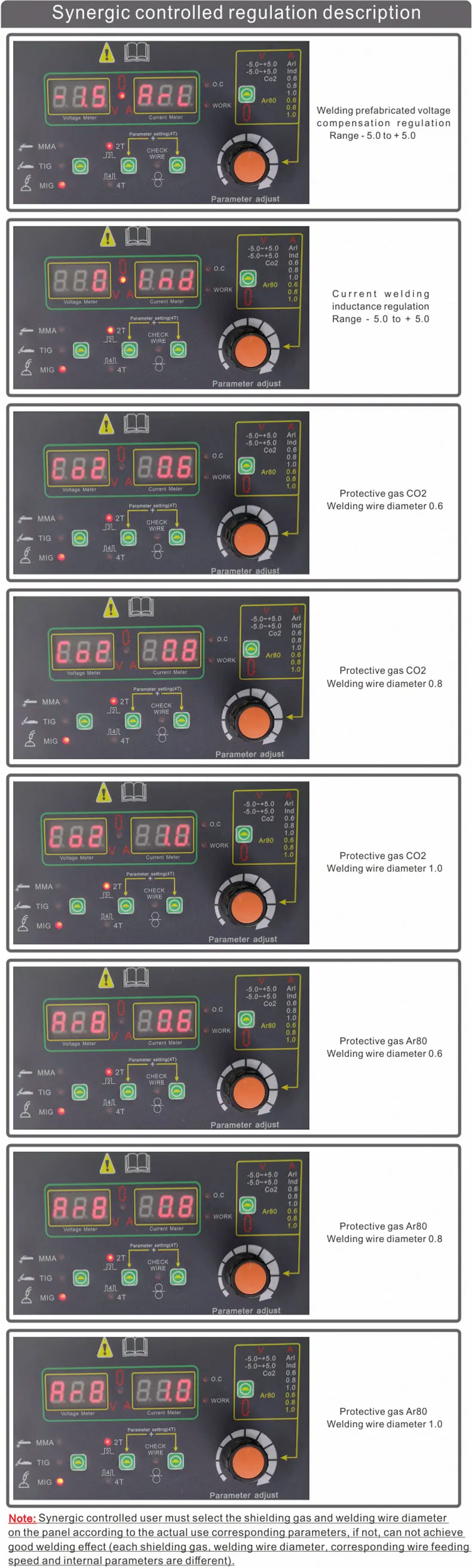 2. Диаметр проволоки и газ являются необязательными на панели. Просто работать с функцией «Управление одной ручкой» для провода 0,6, 0,8 и 1,0.