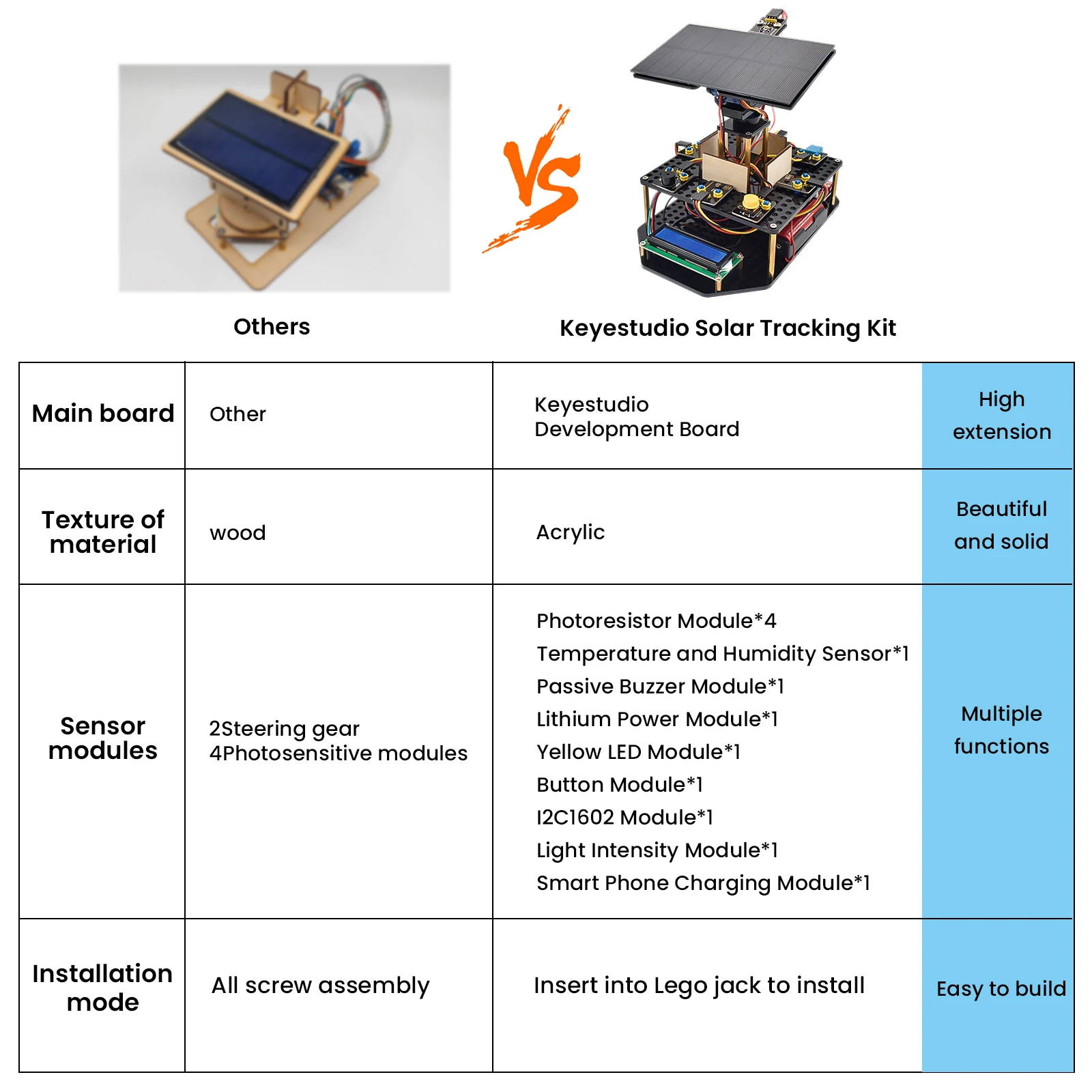 Солнечный набор для отслеживания, запущенный KEYES, основан на Arduino. Он состоит из 4 окружающий светильник датчики, 2 DOF сервоприводы, панель солнечных батарей и так далее, к тому, чтобы превратить светильник энергию в электронный счетчик энергии и мощность зарядки устройств.