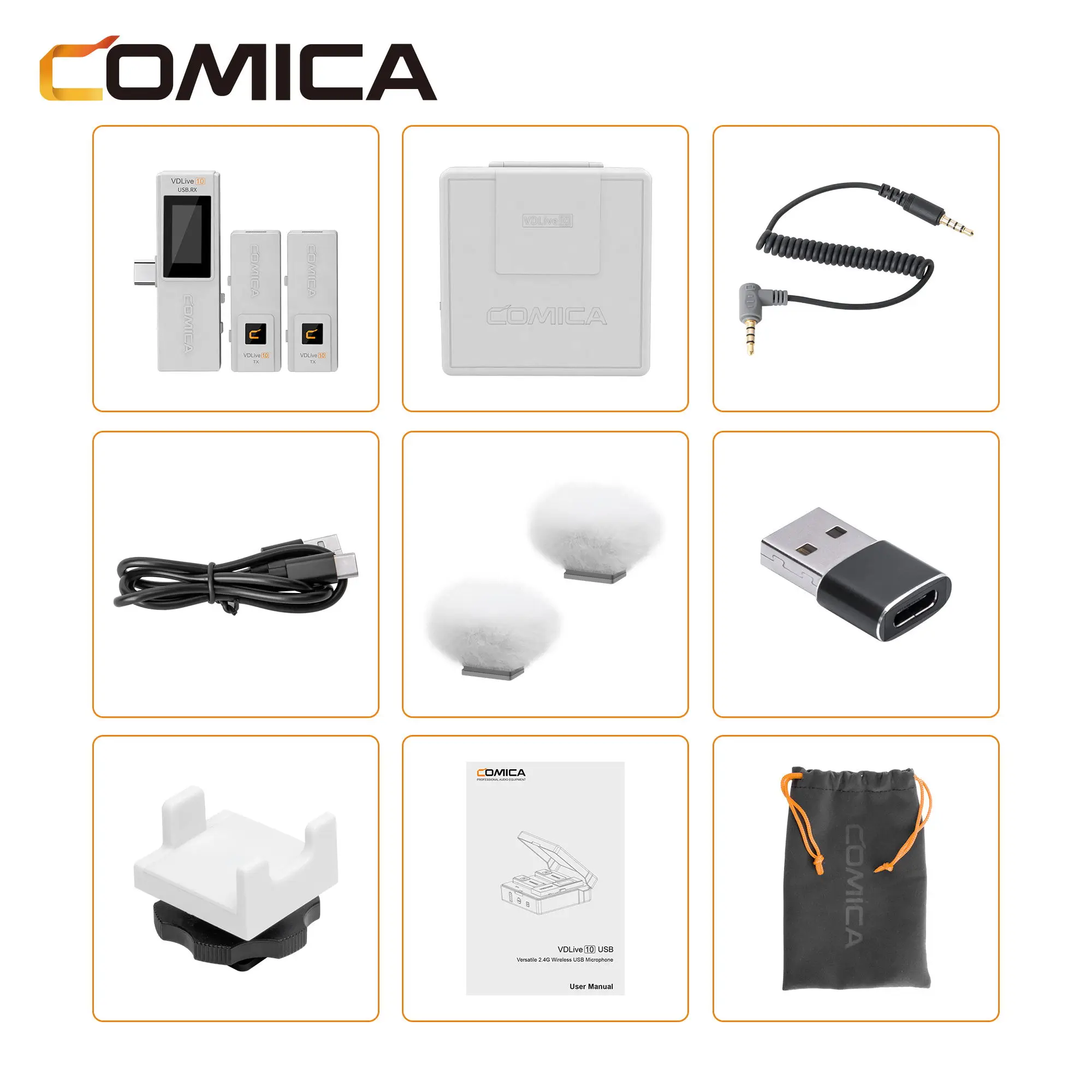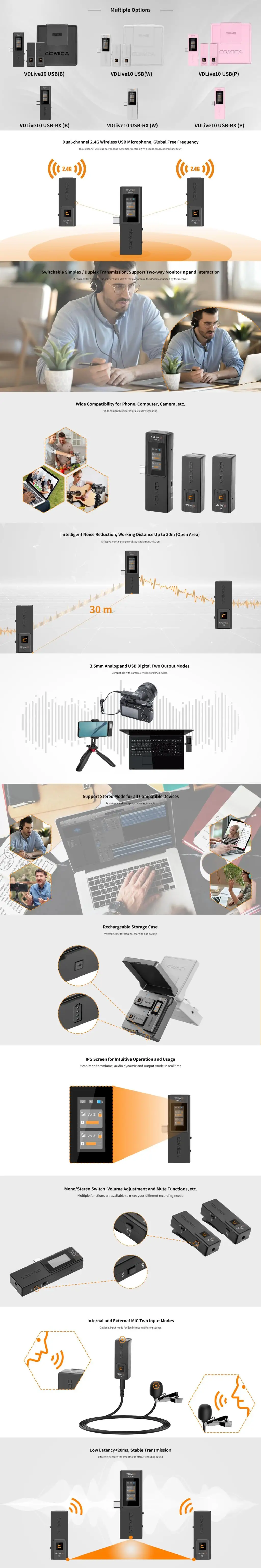 Comica VDLive10 USB универсальный 2,4G беспроводной USB микрофон является беспроводной микрофон с двойной-передатчик, один приемник с технология изготовления свинцово-кислотных аккумуляторов чехол с использованием 2,4G беспроводная технология, Глобальный Бесплатная доставка по всему миру, частоты, разработан с двойным каналом для одновременной записи двух источников звука, переключаемая симплексная/дуплексная передача, двусторонний мониторинг и взаимодействие, Он может контролировать аудио передатчика и аудио платформы на устройстве, подключенном приемником, интеллектуальное шумоподавление, рабочее расстояние до 30 м (Открытая Зона), 3,5 мм Аналоговый и USB цифровой два выхода modescomplible с камерами, мобильными и ПК устройствами, поддержка стерео режим для всех совместимых устройств, двойной трек аудио выход, Удобно редактировать видео, перезаряжаемый чехол для хранения, для хранения, зарядки и сопряжения, моно/переключатель стереосистемы, регулировка громкости и бесшумные функции и т. Д. Внутренний и внешний микрофон два входных режима дополнительный входной режим для гибкого использования в различных сценах. Низкая задержка <20 мс, стабильная передача, эффективно обеспечивает плавную и стабильную запись звука, широко совместима с камерами, мобильными устройствами и ПК-устройствами, такими как ноутбук iPhone iOS android, И может использоваться для ежедневной видеосъемки, видеосъемки в реальном времени (онлайн трансляции в реальном времени, онлайн-конференции, онлайн-обучения) И других сцен для удовлетворения ваших потребностей.