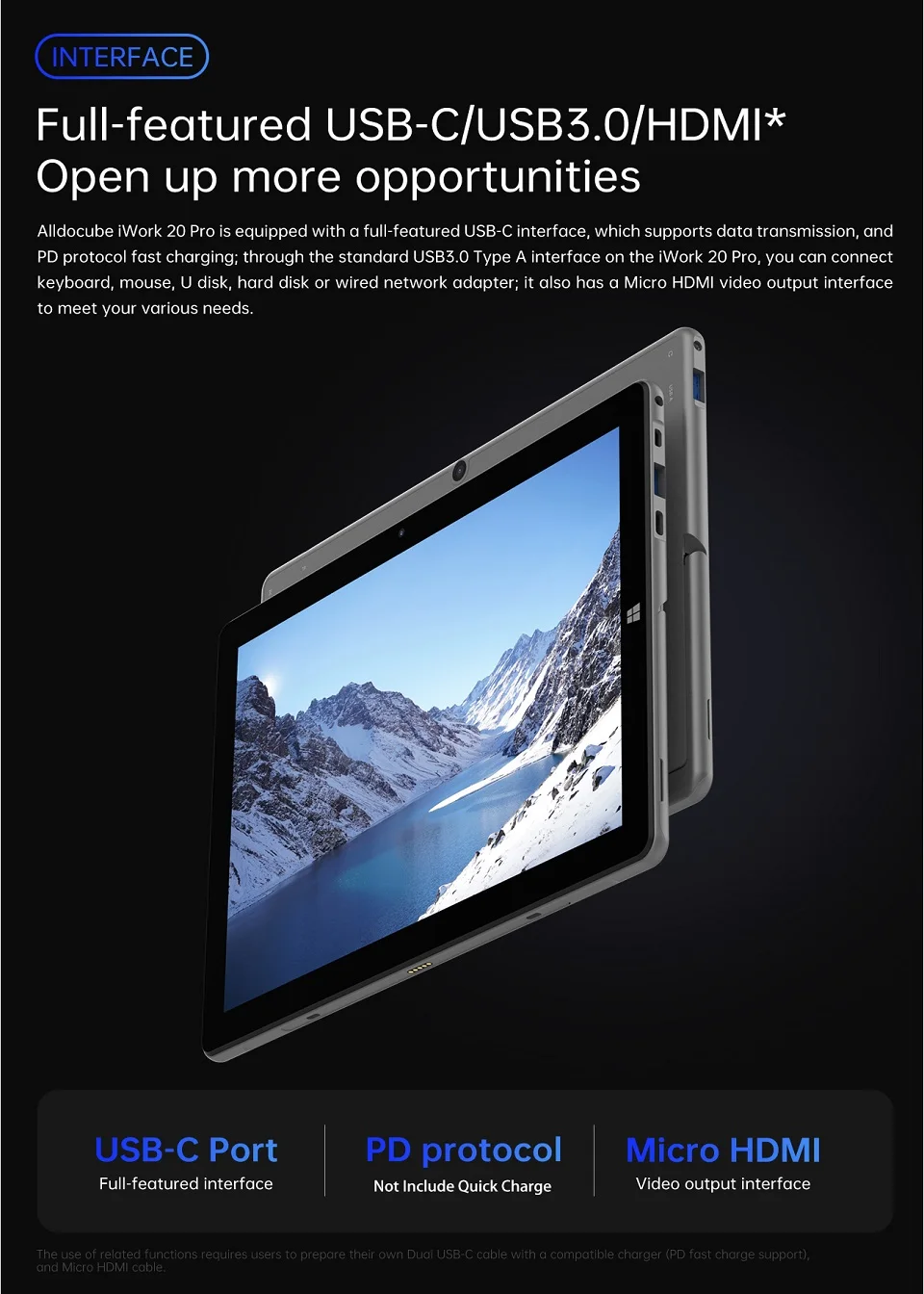 Оснащен полнофункциональным интерфейсом USB-C, который поддерживает передачу данных и быструю зарядку протокола PD. Через стандартный интерфейс USB 3.0 Type A можно подключить клавиатуру, мышь, u-диск, жесткий диск или проводной сетевой адаптер. Он также имеет интерфейс видеовыхода Micro HDMI для удовлетворения ваших различных потребностей.