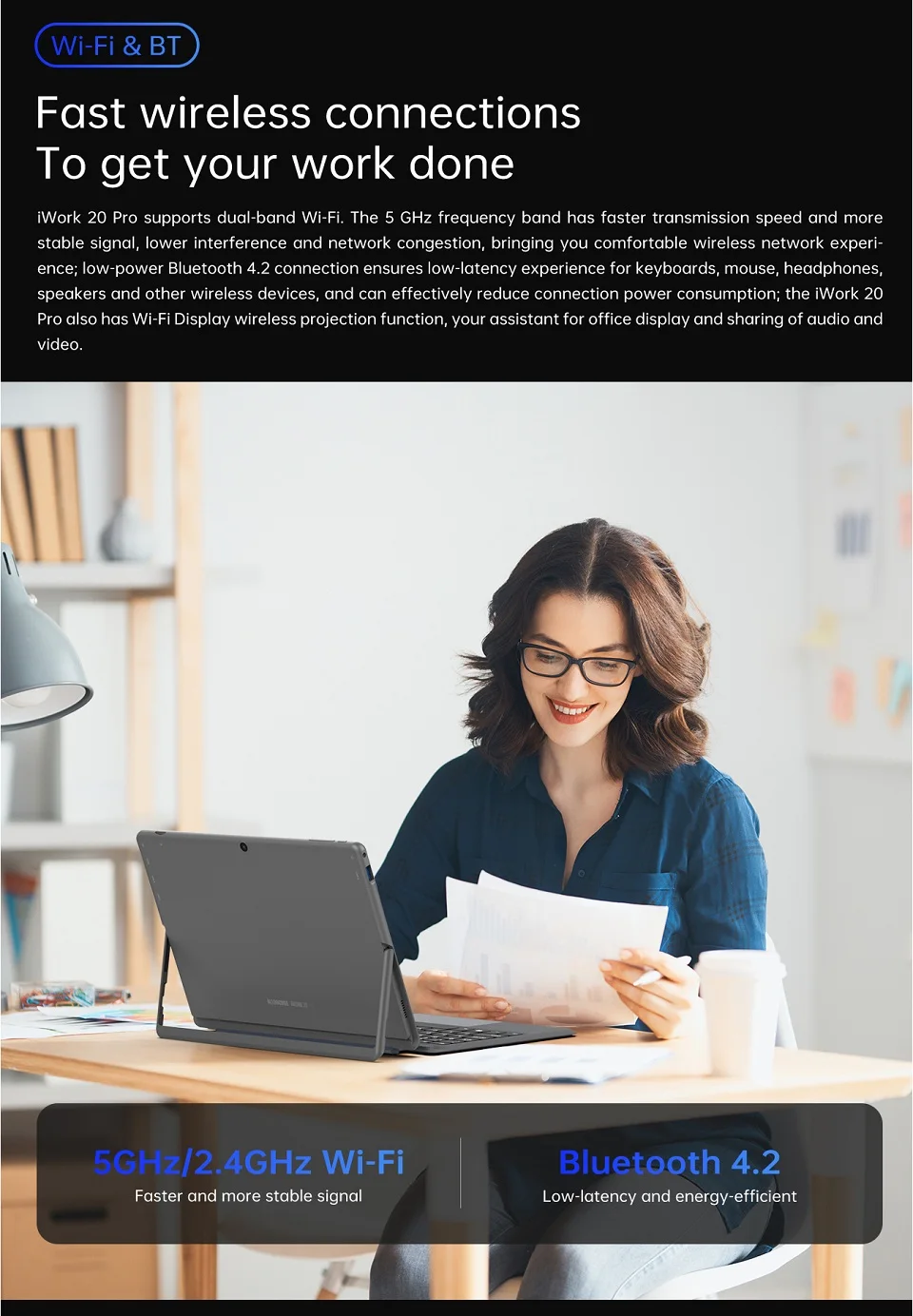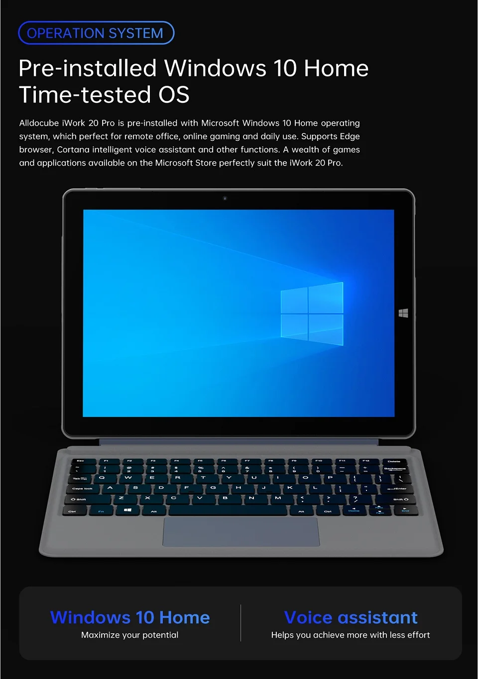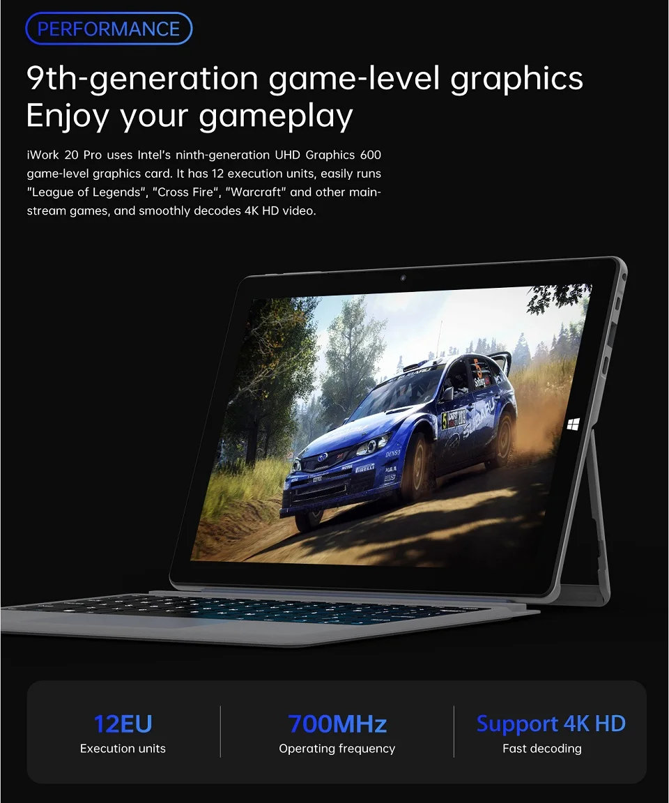 IWork 20 Pro поддерживается Intel Celeron Высокопроизводительный 4 ядра/4 нити процессора до 2,6 ГГц пик турбо частота. Он имеет как ноутбук-как мощную производительность, так и портативность планшета.
