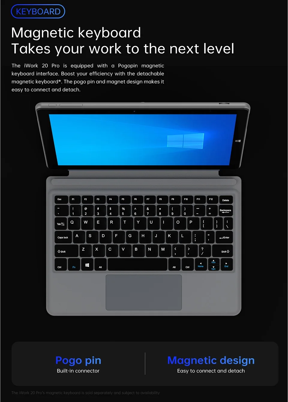 IWork 20 Pro оснащен магнитной клавиатурой Pogo pin, повышающей эффективность благодаря съемной магнитной клавиатуре. Конструкция pogo pin и magnet позволяет легко подключаться и отсоединяться, многие пользователи восхищаются тем, насколько классно клавиатура. Он очень удобен в использовании, что делает его легче печатать во время использования ноутбука.
