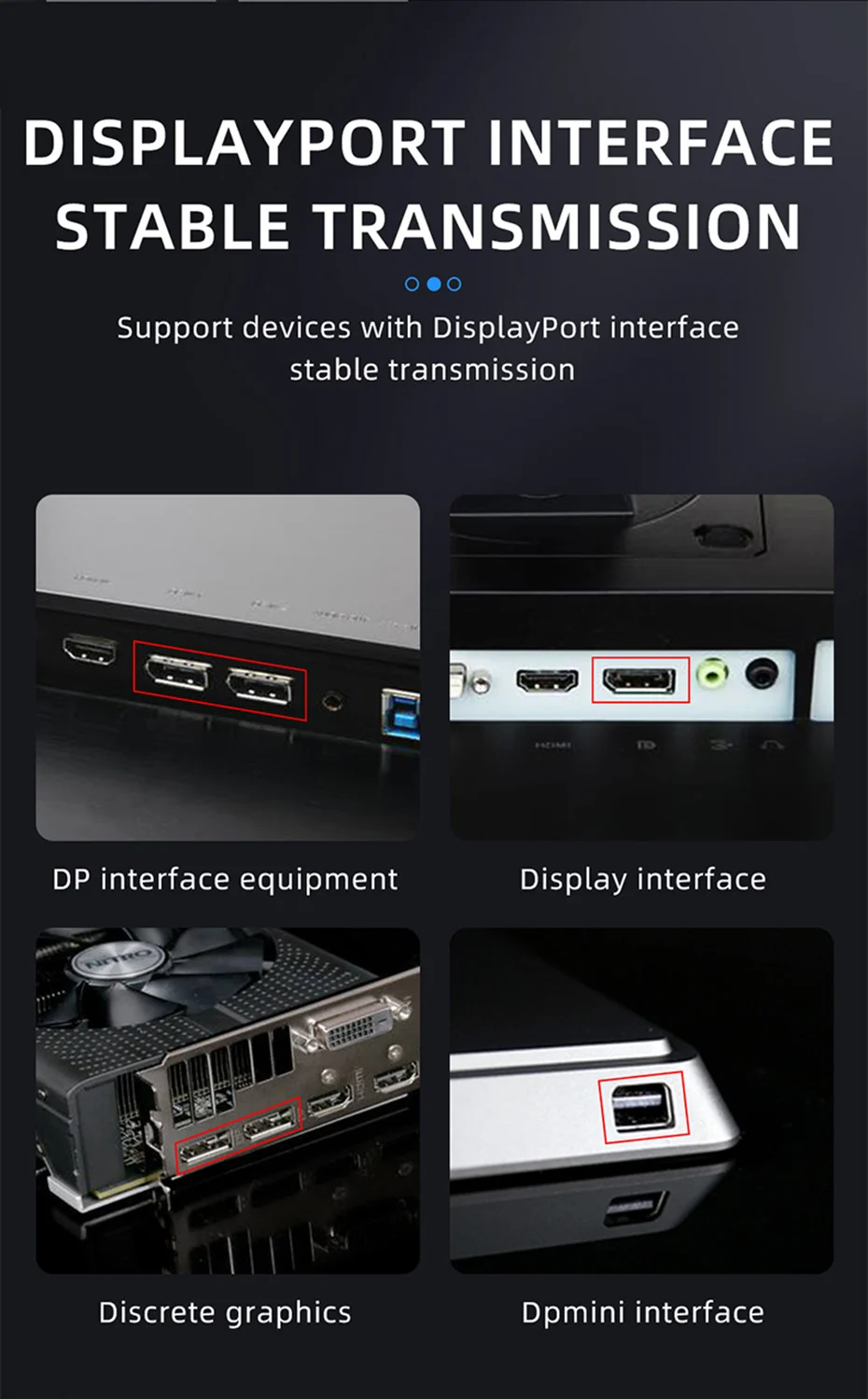 Поддержка устройств с интерфейсом DP, некоторыми ноутбуками, настольной компьютерной видеокартой может быть подключен к мини-кабелю DP, стабильная передача. Поддержка разрешения 4K x 2K HD, четкий и детальный дисплей.