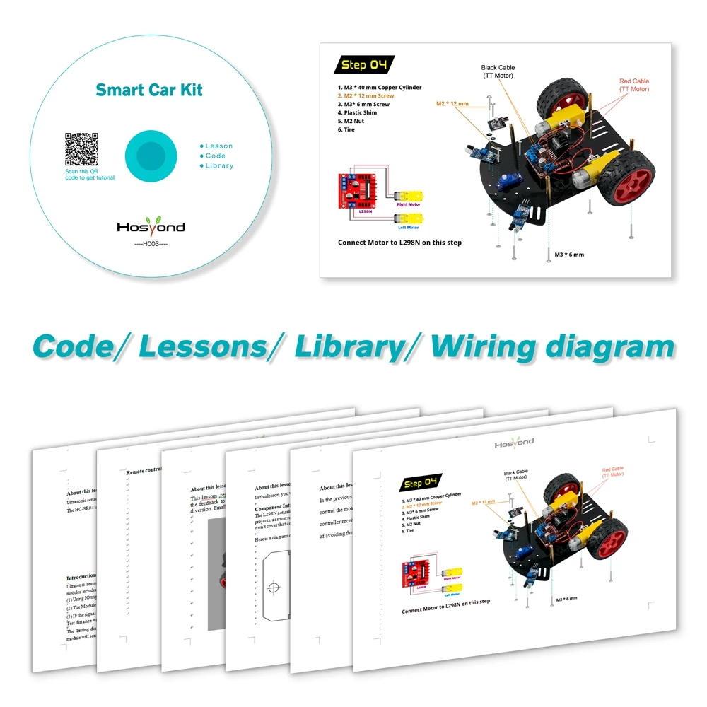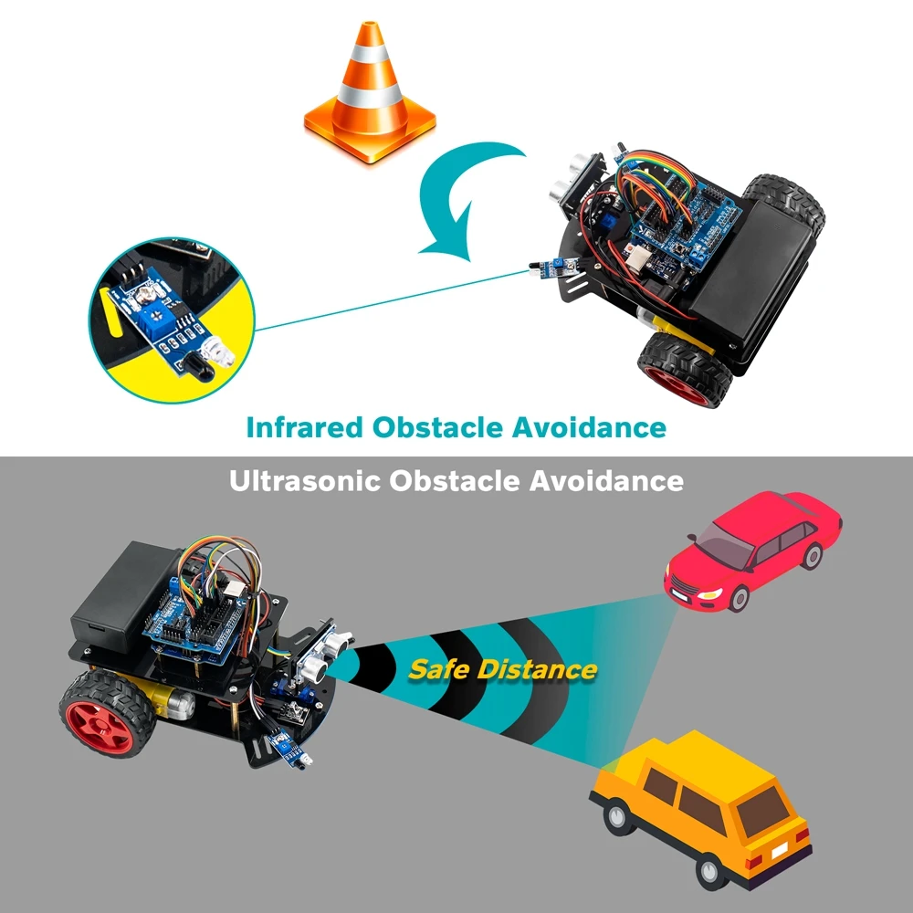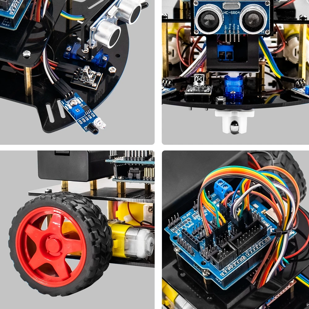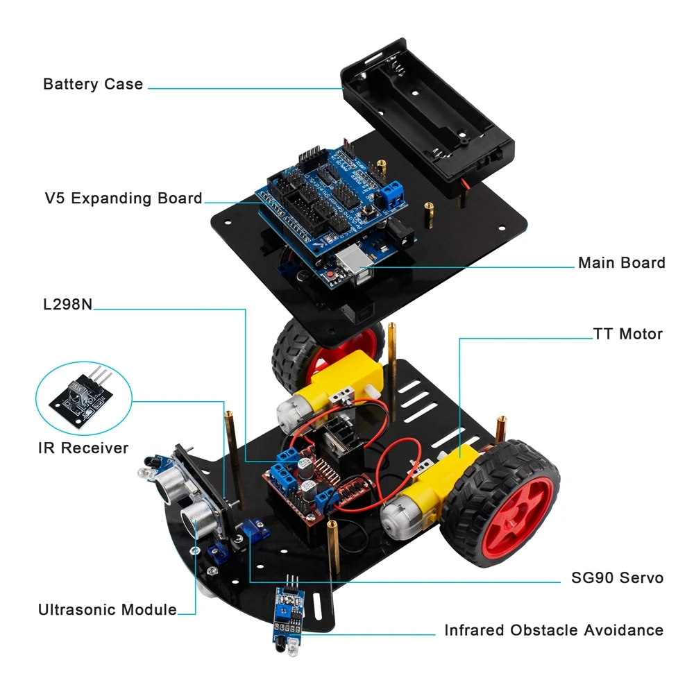 ★Примечание: В этом комплекте используются 18650 батарей (2 шт.), но мы не можем отправить любые аккумуляторы по воздуху, поэтому просьба напоминать клиентам о необходимости подготовки перед получением комплекта● Hosyond Smart Robot Car-это Обучающий набор, основанный на программировании Aduino, который является интегрированным решением для обучения роботов и обучения программированию.● В комплект входит учебное руководство CD, которое содержит подробные инструкции по сборке, коды, библиотеки и учебные программы. Вы можете завершить этот проект самостоятельно с помощью учебника CD. Это улучшит ваши ручные способности и мышление.● Умный робот-автомобиль может достичь таких функций, как ультразвуковое Предотвращение препятствий, инфракрасный пульт дистанционного управления. Вы также можете расширить другие функции с помощью программирования самостоятельно.● Он предназначен не только для учащихся Arduino, но и как игрушка для детей. Конечно, в качестве подарка друзьям тоже очень хороший выбор.СПИСОК КОМПОНЕНТОВ:1 шт. плата UNO R31 шт. USB кабель1 шт. V5.0 Плата расширения1 шт. плата драйвера двигателя L298N1 шт. ультразвуковой датчик1 шт. ультразвуковой держатель1 шт. мотор сервопривода1 шт. Серводвигатель фиксированная пластина2 шт.2 шт. колеса1 шт. пульт дистанционного управления1 шт. ИК модуль приемника1 шт. батарейного ящика2 шт. TCRT5000 модуль отслеживания2 шт Акриловые пластины2 винта и гайки для каждой детали1 шт. 40pin F-F dupont провод1 шт. отвертка2 шт. Кабельные муфты ремень1 шт. CD с обучающим руководством