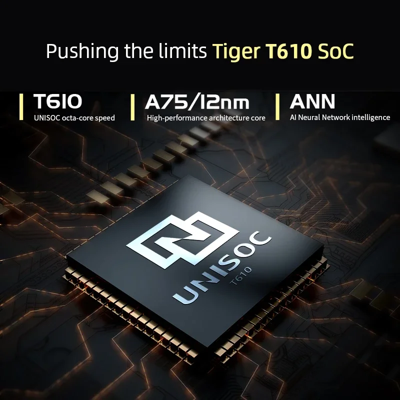 CPU: UNISOC® Tiger T610 octa-core (ARM 2×A75 2.0Ghz and 6×A55 2.0Ghz cores)