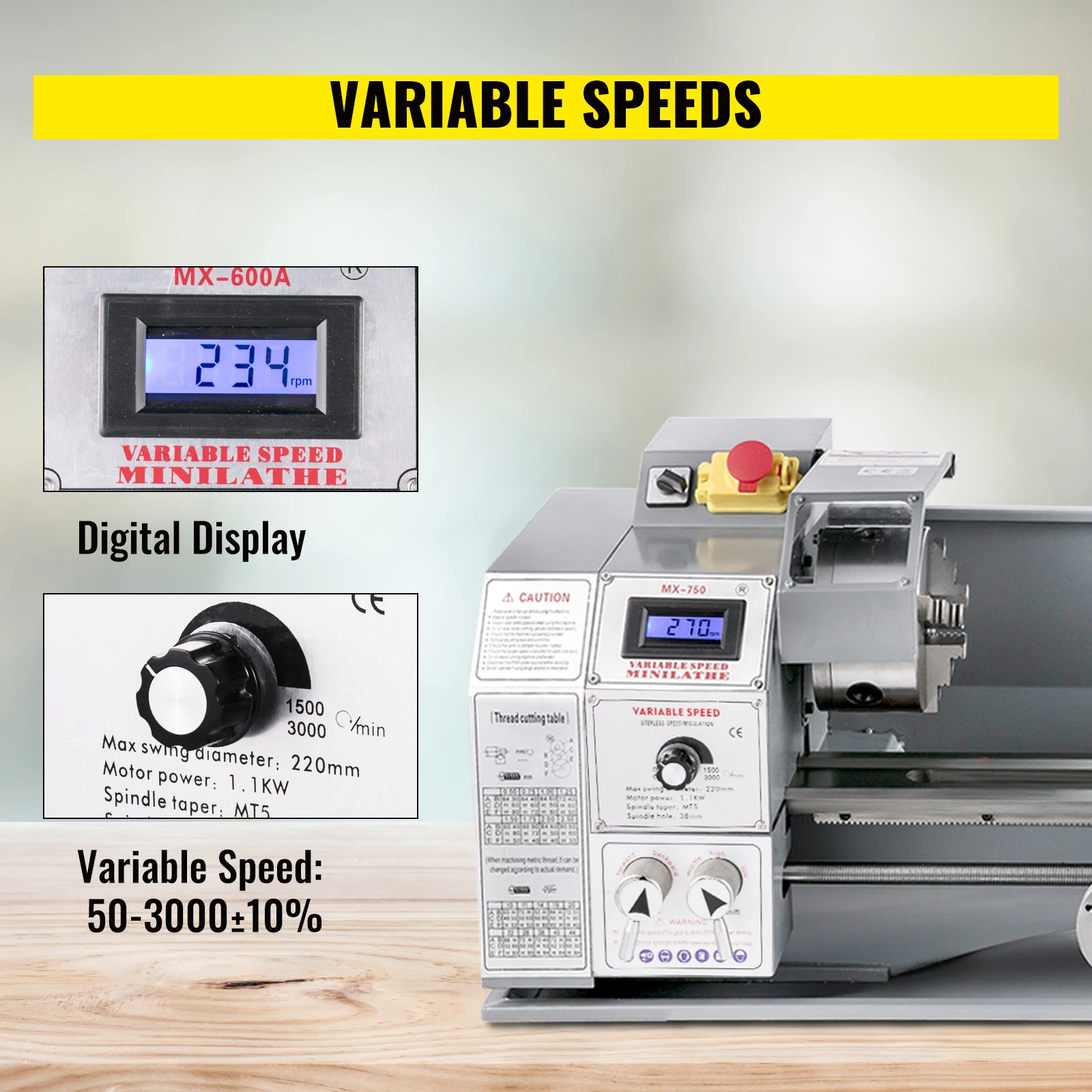 220x600 мм точность металлический токарный мини-станок включает в себя 1,1 кВт Мотор, 3-кулачковый патрон, MT5 шпинделя конус, MT2 Задняя бабка конус, разработан, чтобы выполнять различные виды металла токарная обработка, простой в использовании. Благодаря высокочастотному процессу закалки и точности измельчения высококачественного чугунного токарного станка. Скорость вращения шпинделя 50-3000 ± 10% бесконечно регулируется. Стабильный и контролируемый отдых для больших и/или тяжелых комнат.